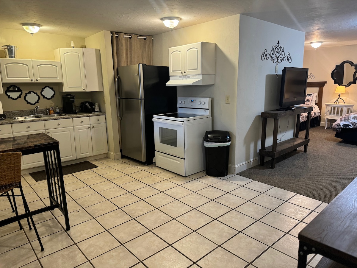 A stay in our Efficiency Apartment is truly like having a home away from home. It comfortably sleeps up to four people with an en suite bathroom that features a tub/shower. The sitting area is great for relaxing, while the kitchenette includes a large refrigerator, oven, microwave, and a coffee maker. The private covered patio features an outdoor seating area. This room is on the first floor and has a little more of a basement feel to it with only two windows, but it also makes it cozy.