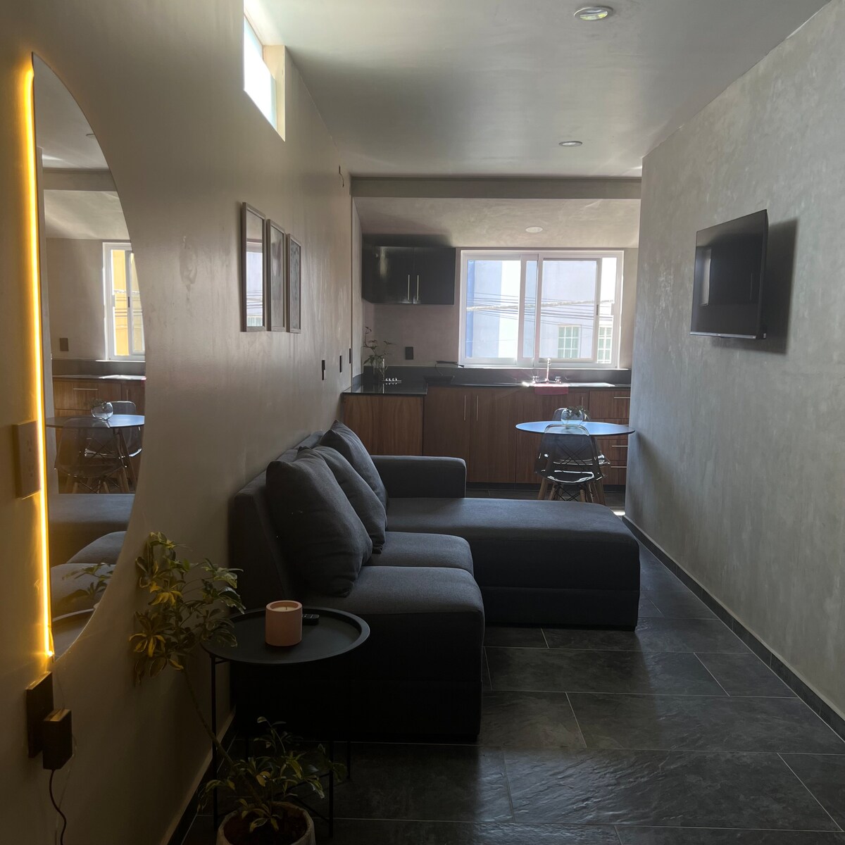 Loft-type apartment with 1 bedroom (one double bed and one single bed) on the second floor, it has an excellent location three blocks from the Guadalupano Sanctuary, one block from the San José hospital in a very central area of the city, it has a washing machine and dryer center.