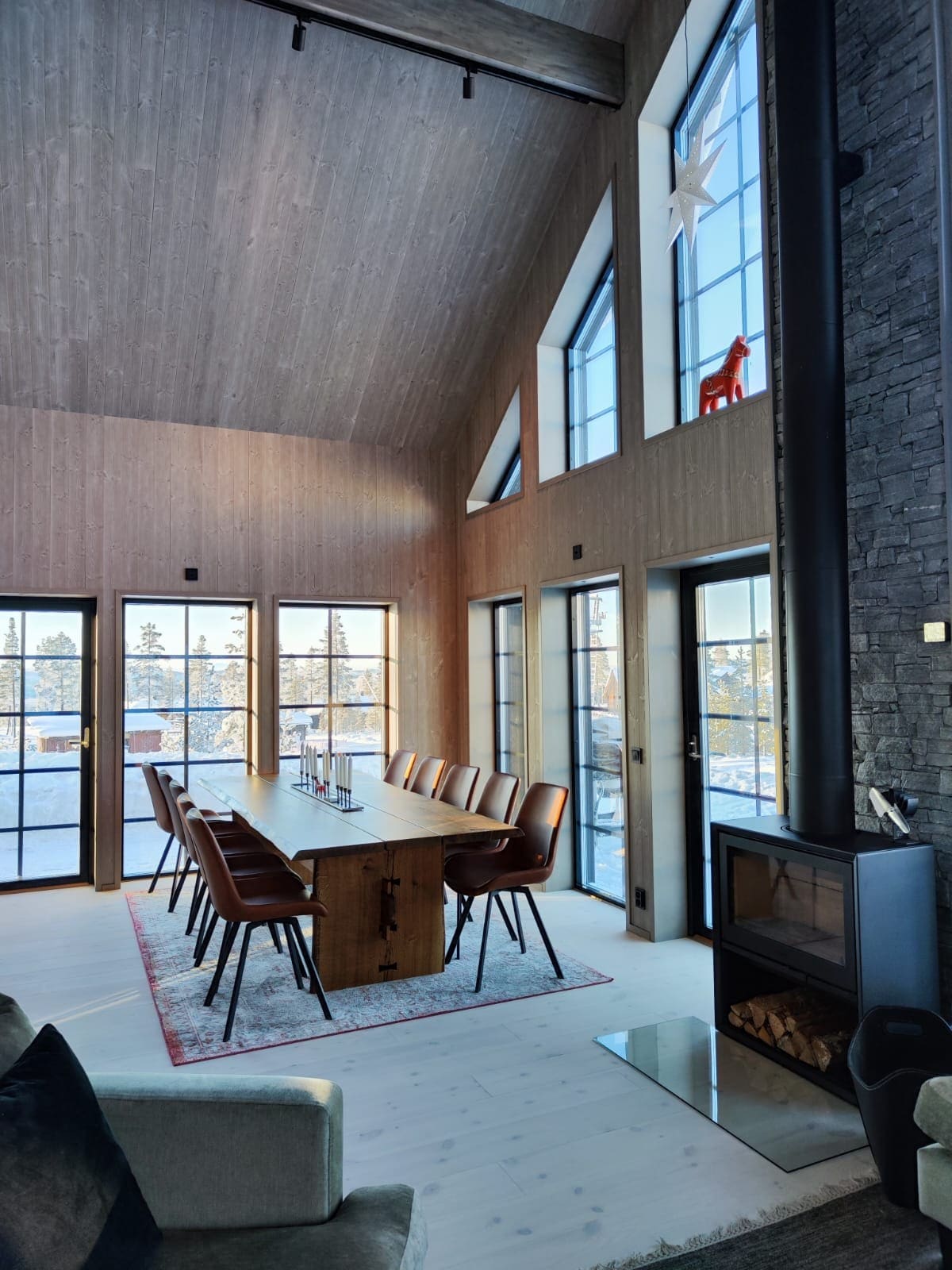 Magical lodge in a quiet location near hiking trails and with sliding distance to skiing in both slopes and trails. After a day up in the mountains, you can come in to the sauna, cuddle up on the sofa by the fireplace or enjoy a dinner around the large dining table in front of the glass walls that frame the mountain environment like a large painting. The lodge is located near Storhogna M where there is a restaurant, ski rental, self-service grocery store and bowling. 2 km away is the mountain hotel with spa and more restaurants.