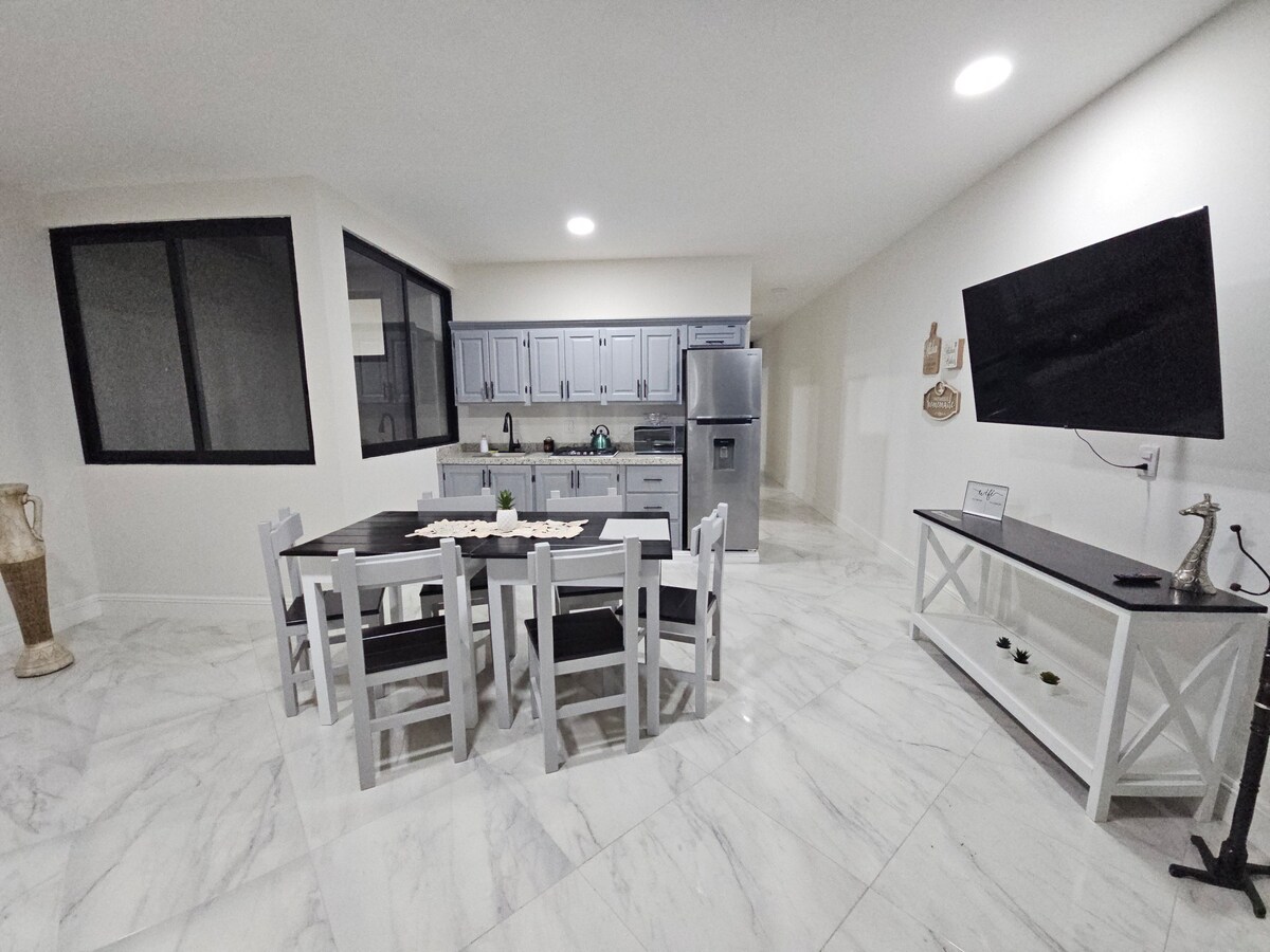 The house is a cozy and comfortable space, in it you can find a full kitchen with some accessories if you want to cook a snack. It also has two bedrooms, each with a double bed, a large closet, blankets, towels, and enough electrical connections to make your stay pleasant. It has a dining room for four people, a medium refrigerator in excellent condition, a bathroom with a shower, a storage patio with a laundry room and a garage for one vehicle.