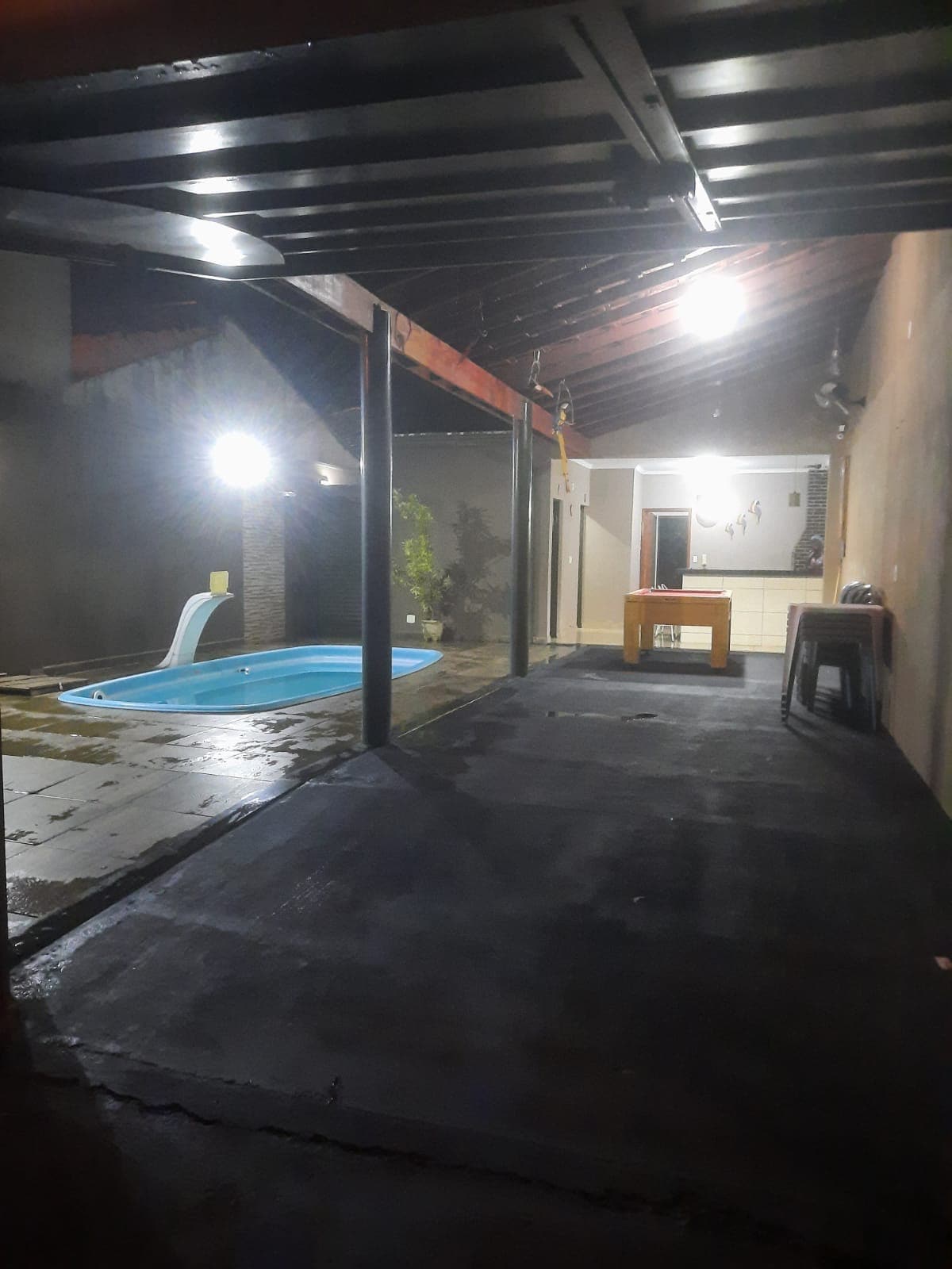 Family Leisure Area (Available for Agrishow) Space available for 50 People. Leisure space with swimming pool, kitchen, barbecue, 3 bathrooms, 1 bedroom with 2 bunk beds, 1 double mattress, 1 beer cooler, 1 refrigerator, 1 stove, 1 electric oven, 6 board games, surround sound, pool table, Wi-Fi, 2 televisions, 1 projector and garage for two cars. Other Observations We do not offer bed and bath linens.