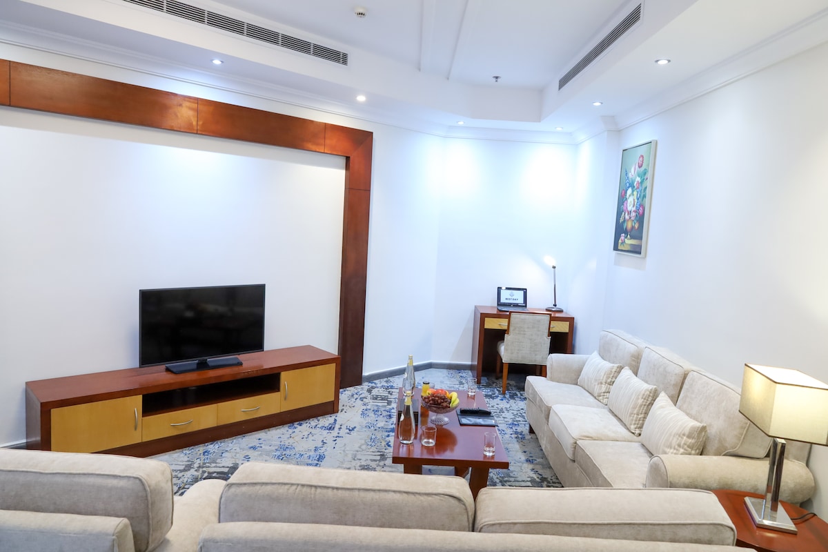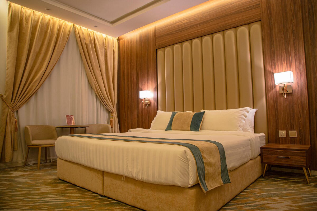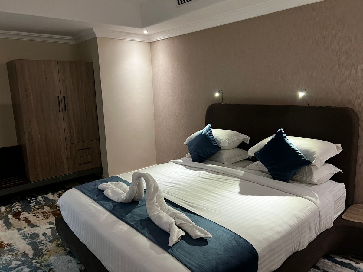 This space is characterized by tranquility, modern design and modern technology. The room also features tranquil lighting, upscale hotel brushes, and attention to the finest details of cleanliness,, room service and reception available throughout the hour,,, hotel proximity to services such as(supermarket,restaurants, mall, laundry, mosque, bakery and many more), in addition to discerning reception staff in how to serve the guest and meet wishes, the room has a washing machine, a safe, a smart tv TV screen, and an iron.