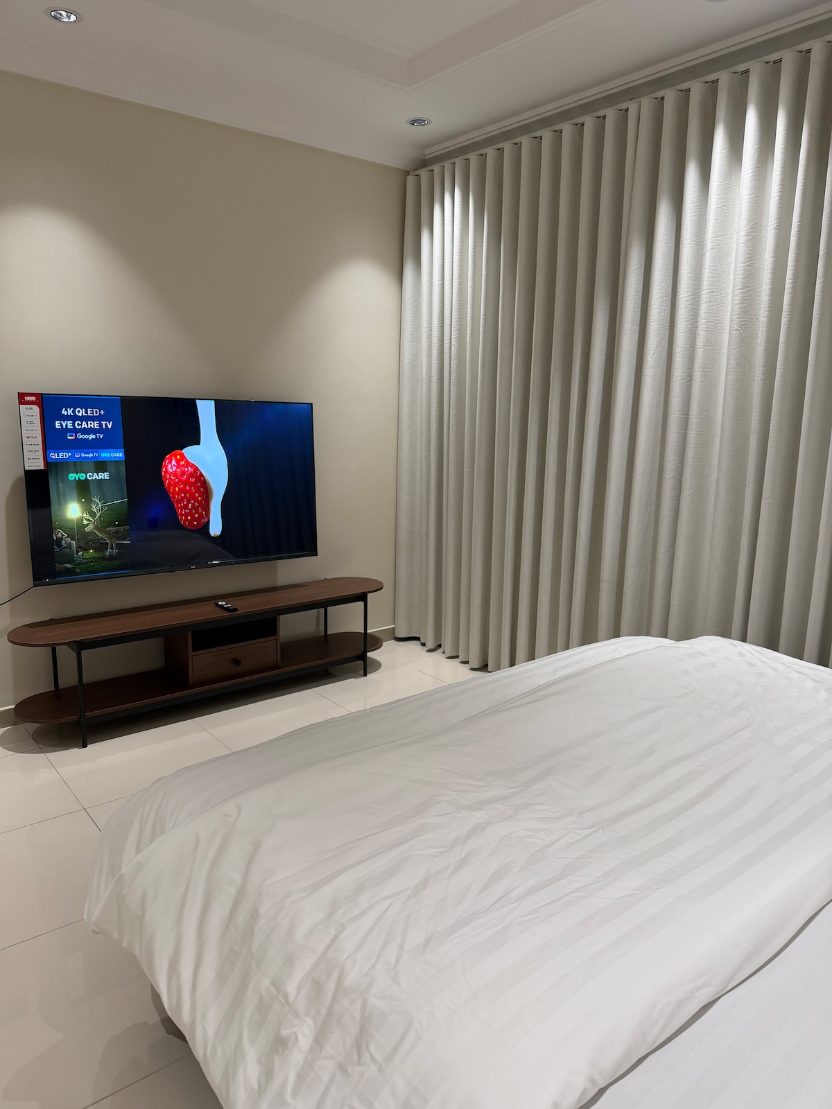 A bedroom and a living room with a bohemian design combined with modern design that combines comfort and elegance Private parking Double bed with a comfortable hotel mattress Bedside storage units Elegant glass wardrobe Stylish hairstyle with a modern design 65-inch 4k screen A corner dedicated to making coffee with all accessories Refrigerator that provides enough space to store drinks The bathroom is carefully equipped with disposable toiletries Living room with a quiet and elegant design It has a privileged location as it is away from Airport 10 mins Waterfront 14 min Al Jawhara Stadium 18 min Next to all services