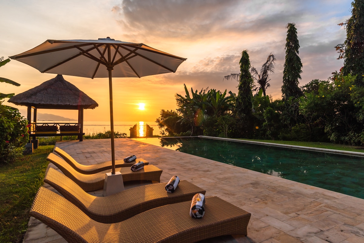 Uniquely located private villa in North Bali. Enjoy complete privacy in your villa with a private pool and an in-house chef, far from the noise of traffic. Escape to a luxury beachfront villa, ideal for families, friends, or a romantic getaway. Situated in a serene bay known for its dolphins, surrounded by rice fields. Explore the nature and culture of North-Bali with day trips, dolphin excursions, snorkeling, and diving tours or just relax by the pool. Our dedicated staff ensures your comfort.