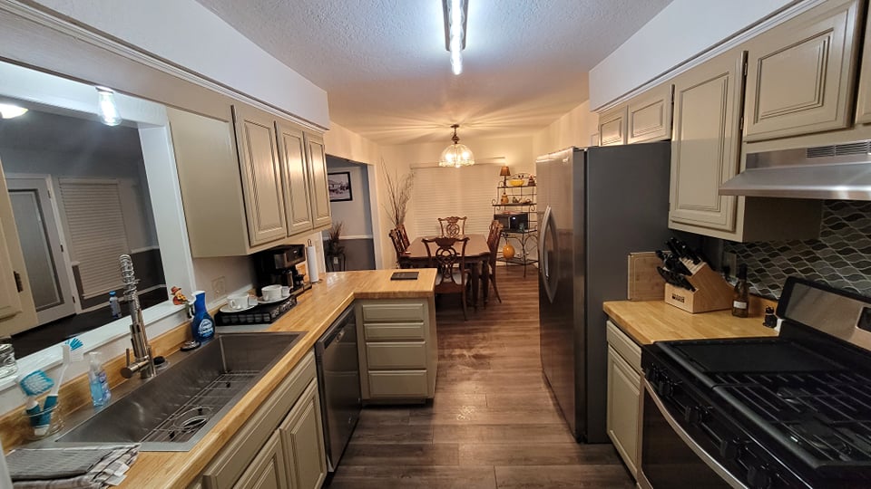 2000 square feet and located on nearly an half acre of manicured wooded space. The yard backs up a stream and has 3 distinct levels: deck, pool, and green spacious yard. The kitchen has all amenities & we have indoor dining seating for 12. The living room seats 8. There’s lots of outdoor seating as well. PLEASE NOTE: The pool is open May 15th- October 1st. We are one exit up from Riverside and 9 miles from the Gathering Place. We are also on the exit of the brand new Tulsa Premium Outlets.