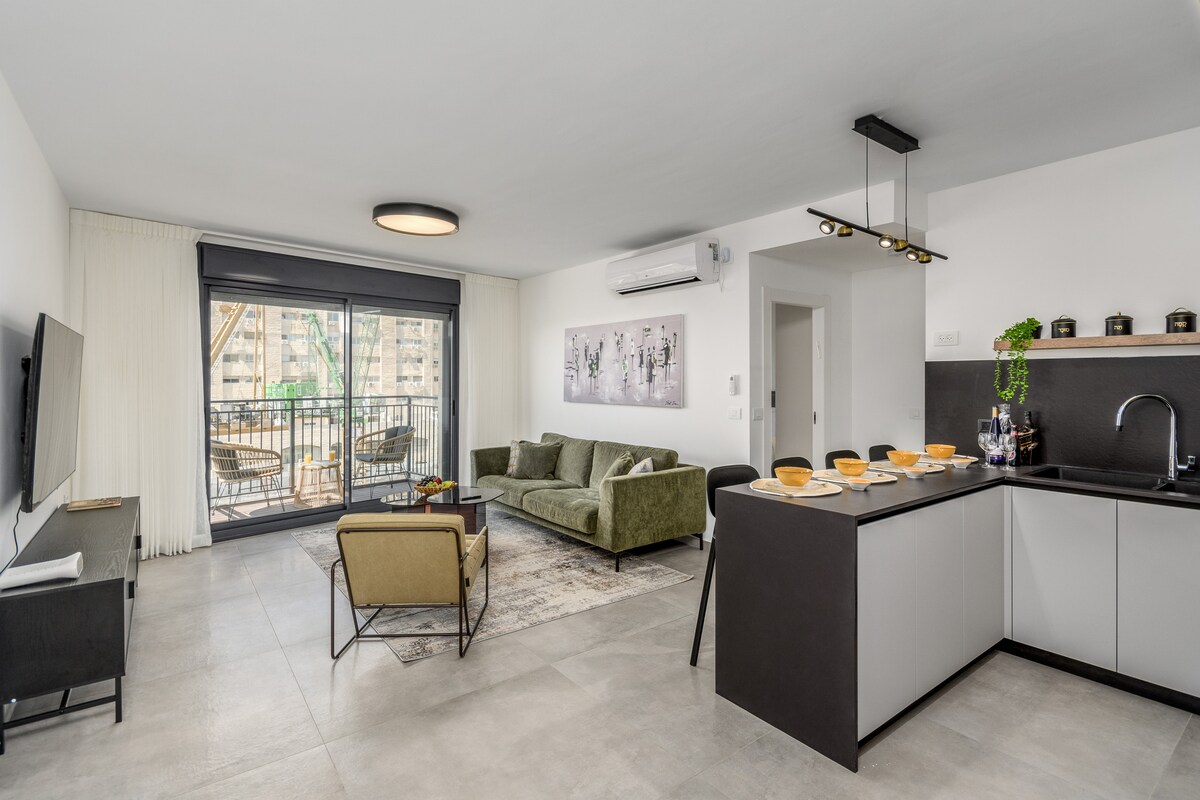 This beautiful 54 m2 apt has an open concept kitchen to the living/dining room one beautiful bedroom, 1 bathroom and a spacious balcony with a stunning view overlooking Jerusalem. The apt is decorated in high-end furniture to meet your all needs... The kitchen is fully equipped with fridge, oven, stove top, dishwasher and Microwave oven. In the living room you can enjoy a comfortable sofa as well as an armchair and a dining room table which can accommodate 5 comfortably.