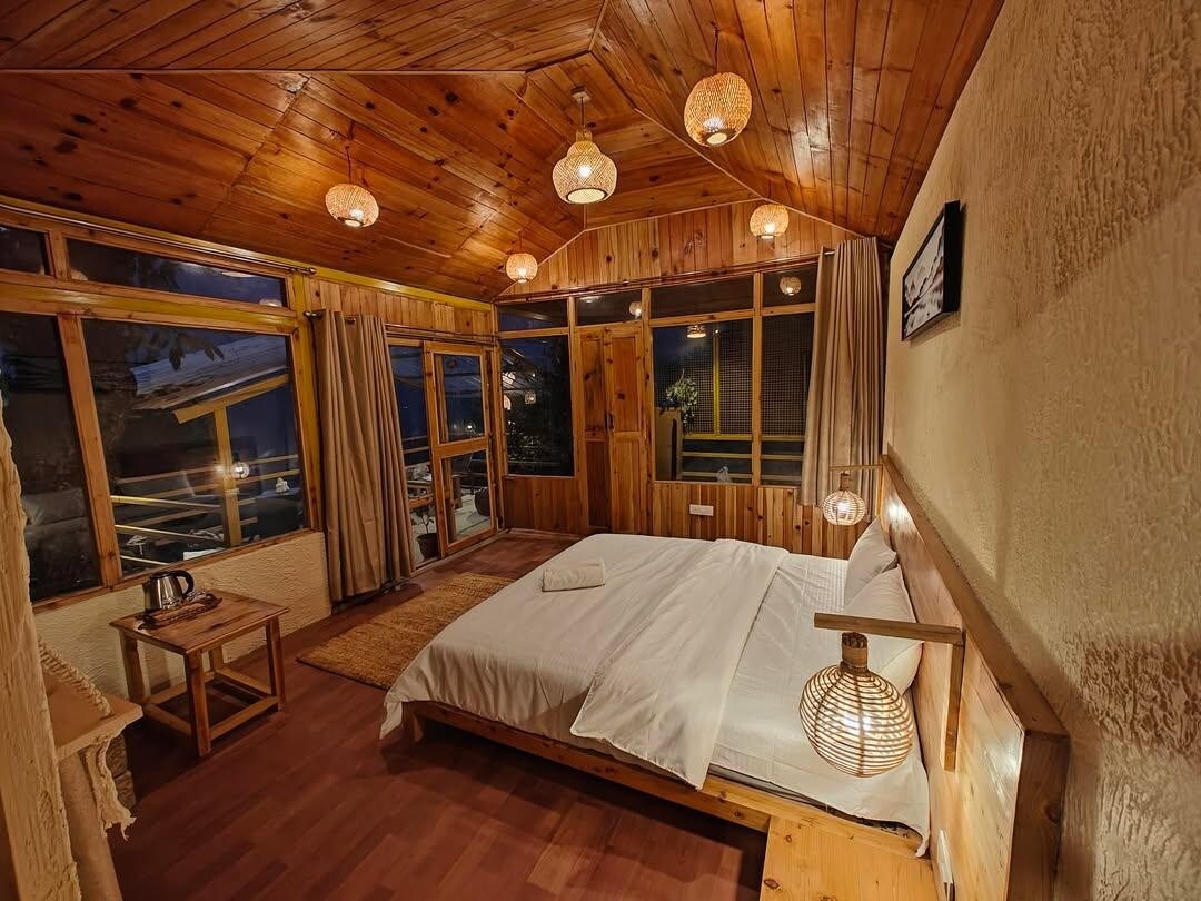 Sukoon A-Frame Treehouse Nestled amidst the serene mountains near Jibhi, Sukoon A-Frame Treehouse offers a peaceful escape surrounded by pine forests and breathtaking views. Designed with cozy interiors, large glass windows, and a touch of rustic charm, it’s perfect for couples or travelers seeking tranquility and nature. Wake up to misty mornings, enjoy your coffee on the balcony, and experience true “sukoon” — peace in the Himalayas. 🌲✨ ⸻