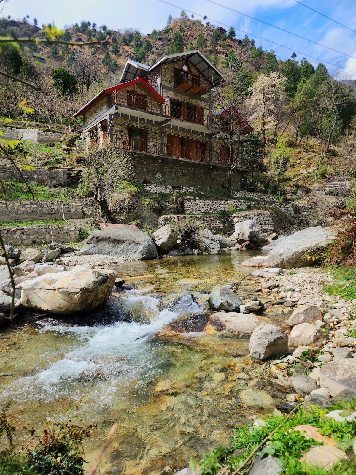 Hidden in plain sight for over three decades, this unique three-bedroom riverside castle home reveals itself along the banks of the Jibhi River. Built over 40 years ago by a Dutch-Indian couple, the estate sits magically amidst a lush private grove of peach, plum, and apricot trees. The architecture strikes a rare balance between rugged mountain strength and whimsical charm, creating an atmosphere that feels as if you have stepped directly into a classic fairytale.