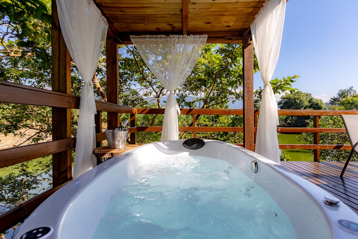 ✨ Lake View Cabin ✨ Cozy and charming accommodations, perfect for those seeking rest and contact with nature. 🔥 Indoor fireplace, full kitchen, bedroom with a box bed, living room and bathroom with a gas shower. 💧 Whirlpool overlooking the lagoon. 🌿 Deck with a view, leisure area with a fire pit and hammocks. 🛏️ Complete set of bed linens and soft towels. ☕ Includes 🐎horseback ride and breakfast basket