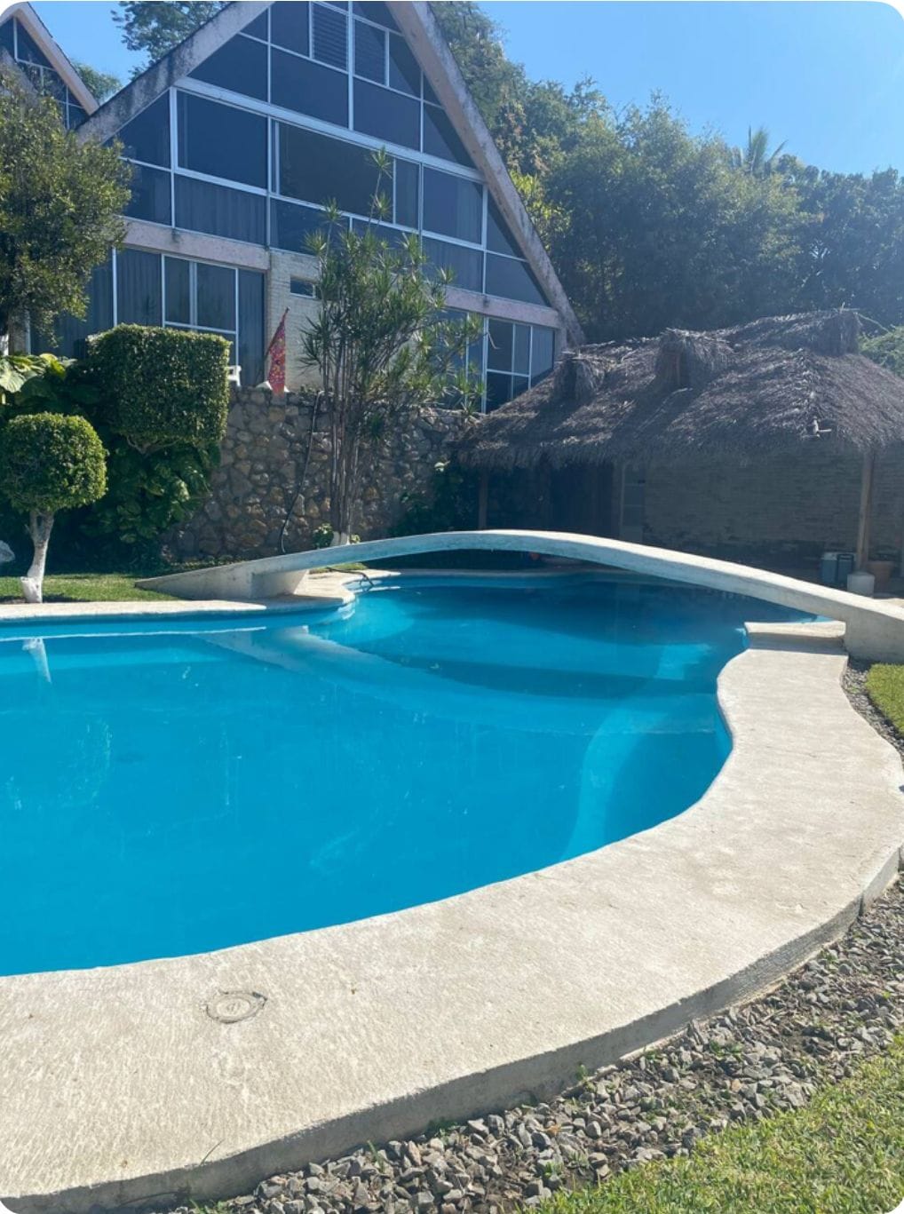 House in Fraccionamiento Bonanza, Jojutla, Morelos. 6 minutes to Tequesquitengo • 2 bungalows, 3 bedrooms, 5 and ½ bathrooms, all with air conditioning and fans, towels, toilet paper. • Up to 20 people. • Kitchen, living room with TV, terrace-breakfast room. • Furnished kiosk. • Grill. • Internet. • 6 x 12 pool, 2 bathrooms, and outdoor shower. • Sun loungers, garden chairs, parasols, pool towels. • Covered parking for 5 cars and uncovered parking for another 6.
