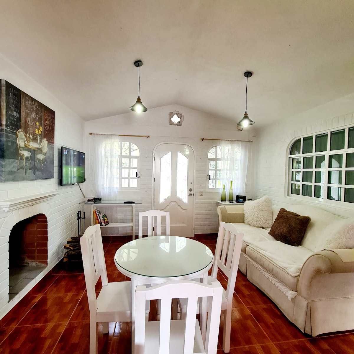 Relájate en pareja o con toda la familia en este alojamiento donde la tranquilidad se respira, adorable mini cabaña ubicada en zona boscosa, rodeada de cedros, un lugar ideal para descansar, hacer una carne asada, picnic o realizar home office. Pero no por eso dejar de disfrutar de tus series o películas favoritas en Netflix, Prime Video, Disney y/o partidos de futbol