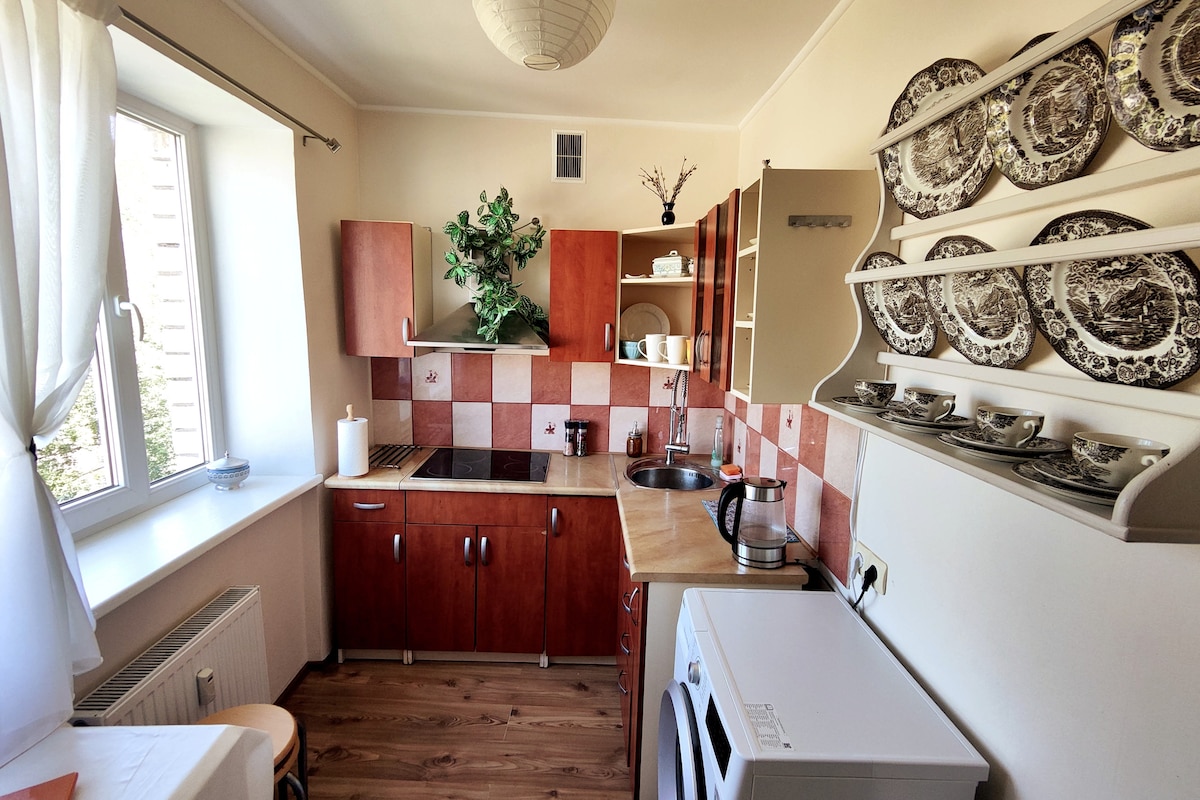 Charming studio apartment in wooden building, built in 1856 and located in a very old town. This 37 sqm space boasts equipped 60-tie’s style kitchenette, queen size bed and a big bath. The place is furnished with selected furniture of different decades.