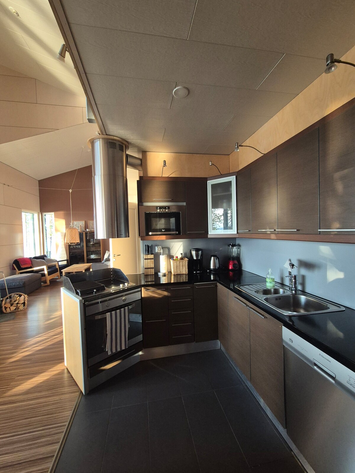 This oasis of relaxation is a magnificent, unique architectural ensemble at the tip of the peninsula, with room to breathe and relax. The cottage is located by the clean Suvasvesi. Next to the main cottage, there is a summer sleeping cabin with stunning panoramic lake views. Large windows bring nature indoors everywhere! A huge terrace area connects the main cottage, the sleeping quarters and the pier complex with the jacuzzis on the beach and the lake surrounds everywhere. It's good to be here :).