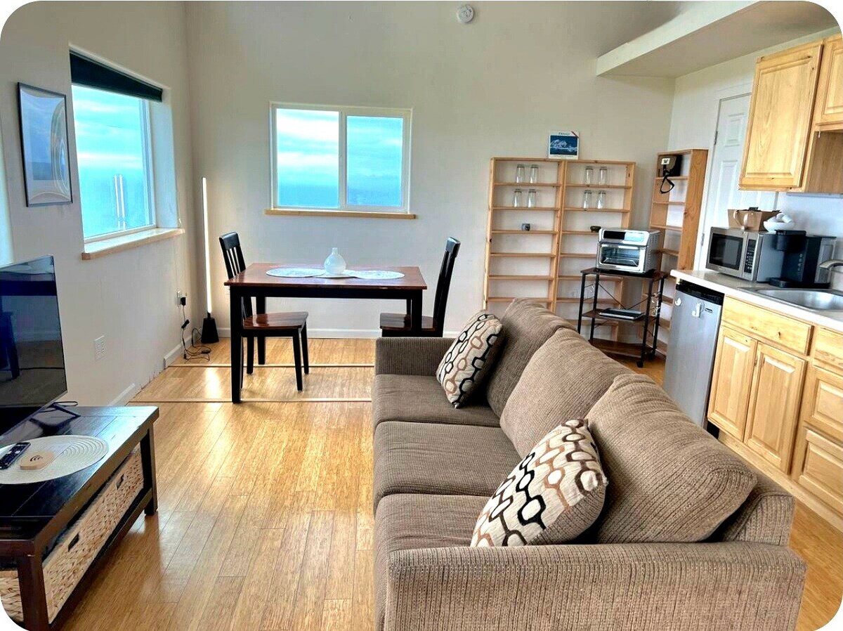 Truly stay in the center of it all on the Homer Spit. Just out your door are the many shops, galleries and restaurants, yet in your beach side suite overlooking the beautiful vistas of Kachemak Bay, you’ll swear you are miles away. Pet friendly, max 2 dogs. Conveniently located above Central Charters and Tours, across the street from the Homer harbor. The Deckhand Suite is our smallest suite, private, cozy, and inviting with a beautiful view. We have 4 more units please inquire