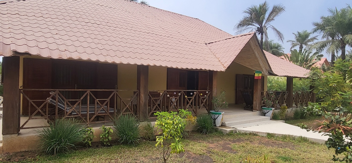 LA RÉSERVE Large houses in the center of Cap Skirring The kitchen is fully equipped, fridge, gas stove, electric coffee maker. 1 bedroom with bathroom 2 bedrooms with shared bathrooms Shower towels, sheets. Terrace with barbecue dining table 3800 m² enclosed land, wooded garden, lush vegetation Quiet place, beautiful view of the Bolong coconut palm trees 1 km from the beach and 200 m from the center of the village. Fans in the living room and bedrooms. Wi-Fi