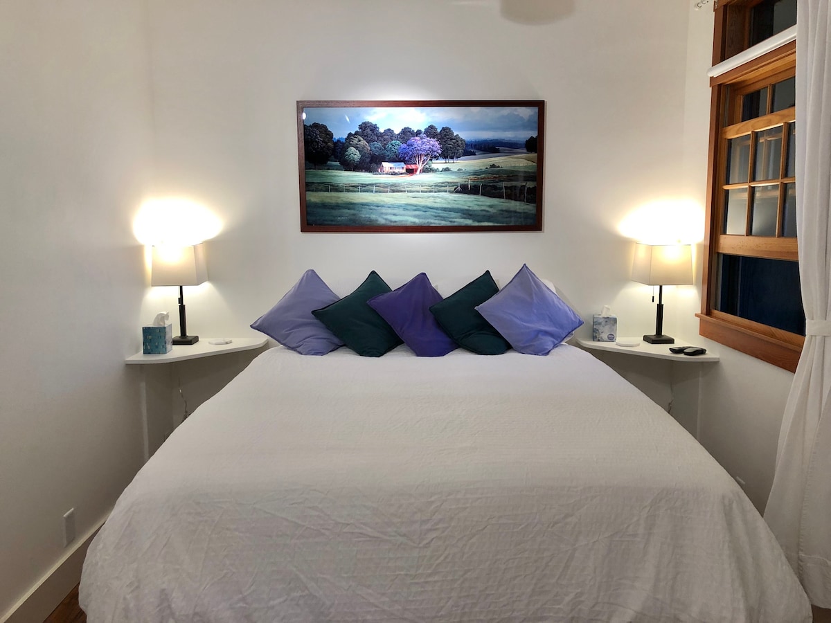 Kula Jacaranda studio is reached by a treehouse walkway. Your private covered deck offers a place to dine and watch the sunset . The shared barbecue area offers a place to prep your own meals. We provide coffee, tea, oil, vinegar and salt. The luxurious walk-in shower offers double shower heads and benches. With years as AirBnb super hosts, we've got everything you need.
