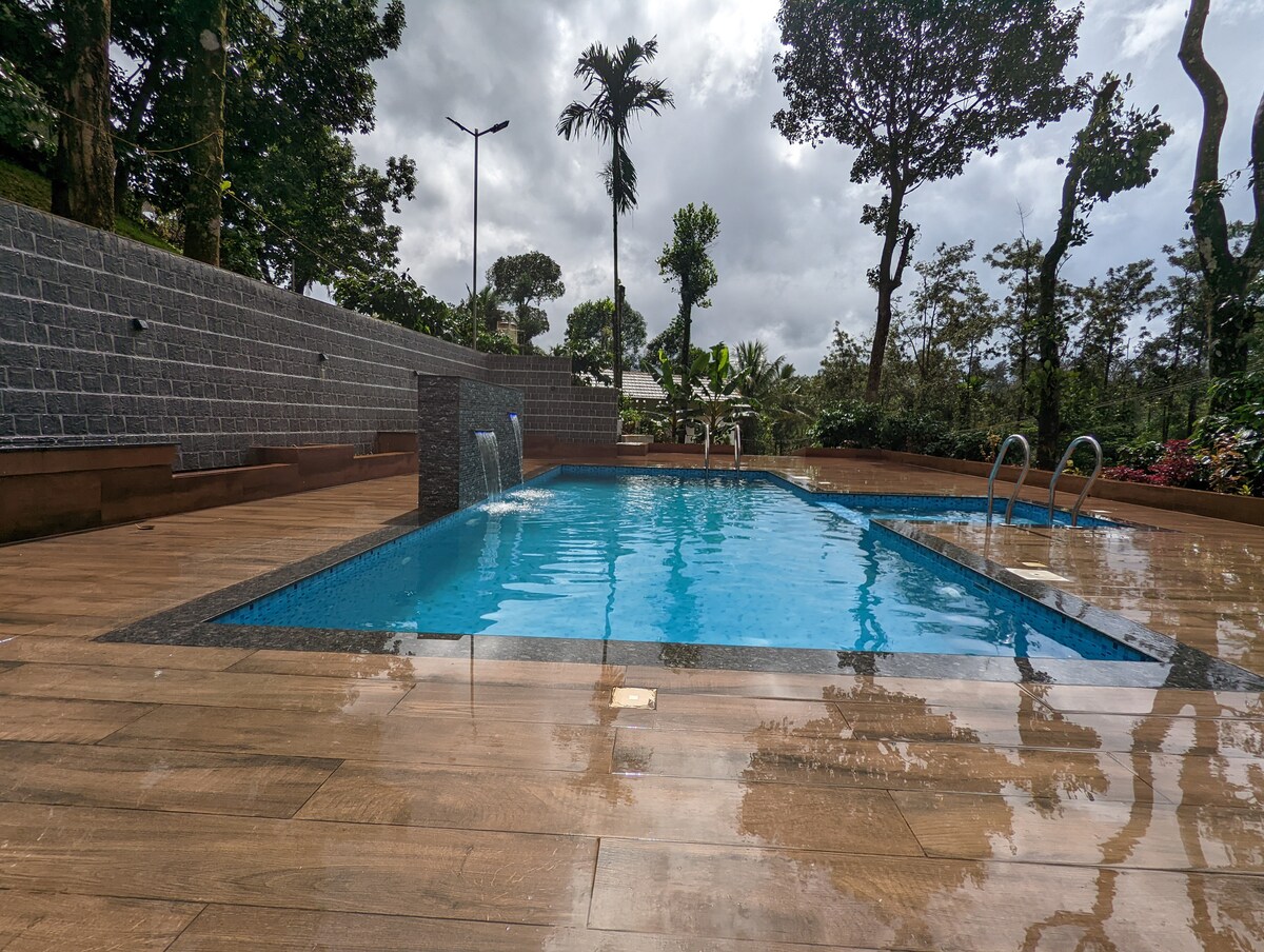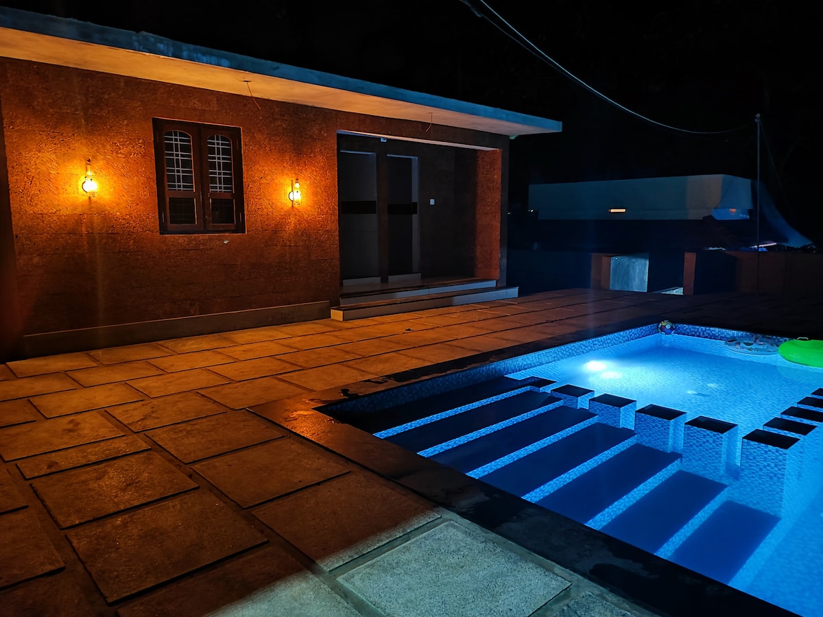 You can relax with the whole family or friends at this peaceful place to stay. Ours is a simple home . fully renovated ,with a Private swimming pool . "Direct room booking" , contact for better rates 2 bedroom 2 bathroom 1 attached 1 nonattached. campfire between 6pm and 8pm Homely breakfast 8.30 to 10am included. dinner and BBQ with additional charges. Zomato is available Pool will be used by host,family or other from 6 to 8am POOL 9am TO 9pm