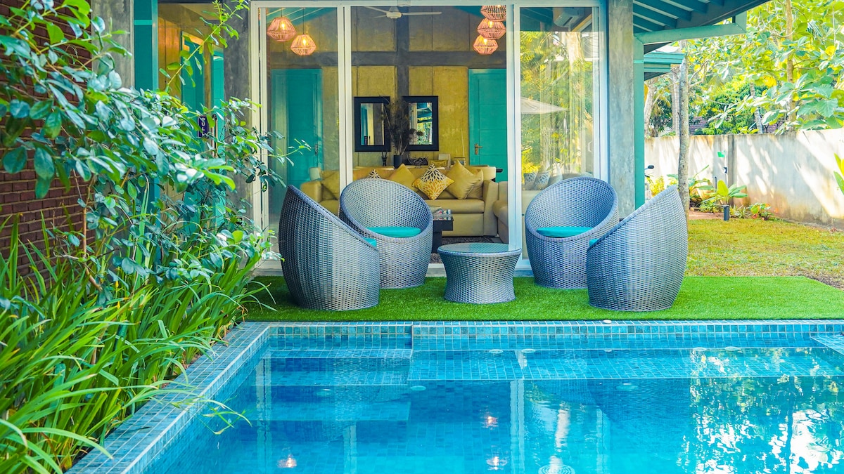 Die Villa 105B ist ein wunderschönes und abgelegenes Hideaway im Südwesten Sri Lankas. Das große Grundstück nahe Bentota zieren tropische Pflanzen, Kokospalmen und duftende Frangipani-Bäume. Das außergewöhnliche Anwesen, erbaut im Stil des legendären Architekten Geoffrey Bawa, beherbergt vier Gästezimmer mit jeweils eigenem Badezimmer. Im Garten befinden sich der Speisepavillon, ein Freizeitpavillon und eine kleine Palmen-Hütte für Yoga oder Meditation, sowie der 15 x 6 Meter große Pool.