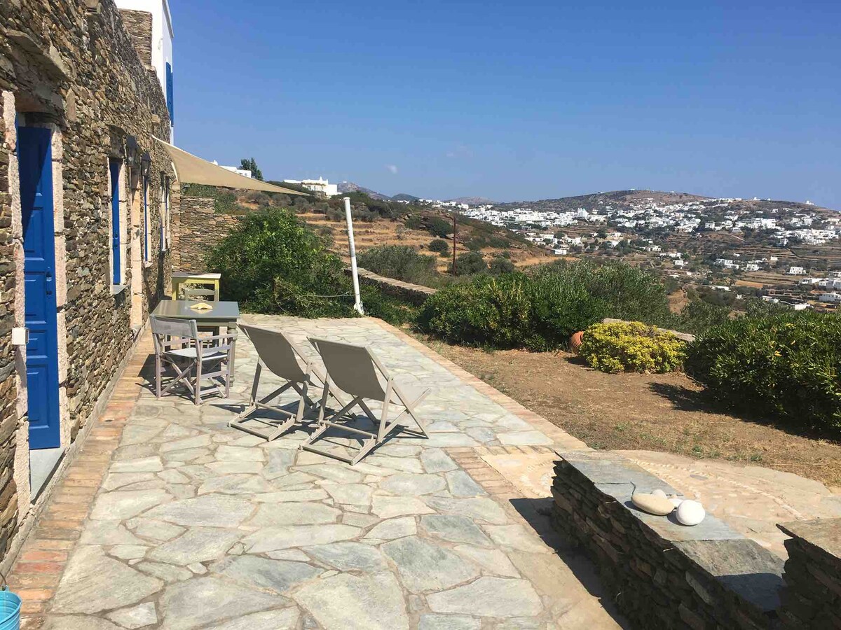 Quiet private house with 180 degree view of the sparkling Aegean Sea and the islands of Paros, Ios, Sikinos and Folegandros; one of the most unique sea views in Sifnos. The house has a full kitchen, indoor dining area, two bedrooms and two bathrooms as well as your own terrace for outdoor dining from which you can enjoy the breathtaking view. You have access to a private path which leads to the sea to enjoy swimming from the rocks in total seclusion and privacy. Free Wifi and free parking.