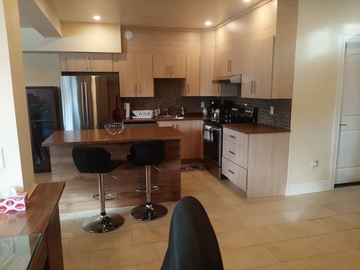 Luxury private guest apartment in a home with separate entrance. Fully furnished. 1400 sqf with 2 bedrooms, 1 King bed, and 1 queen bed, 1 large sofa bed, office room (work-from-home), washroom, laundry room, and open concept kitchen/living/dining/office. Large windows and short basement walls. Located close to 416 and 417 highways, 23 min to downtown Ottawa, 13 min Kanata Park&Ride, 12 min Fallowfield train s, 29 min airport, enjoy living in nature in the heart of the city
