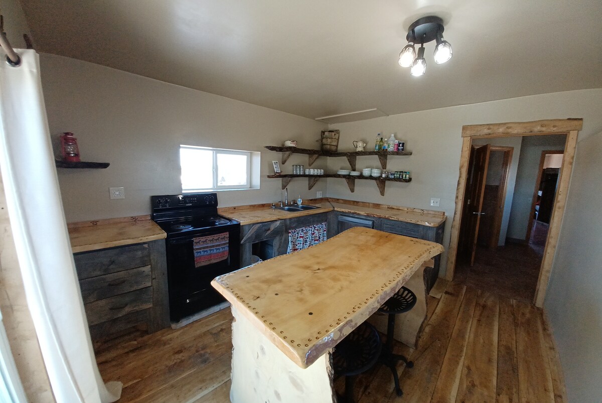Stay in a Real Western Horse Barn! Experience rustic charm with modern comforts in this unique barn-turned-retreat. Handcrafted kitchen cabinets from reclaimed barn wood, custom-milled hardwood floors, and modern bathroom and bedroom finishes create the perfect mix of old and new. Relax on the deck under the stars and soak in the peaceful Western vibes. A one-of-a-kind getaway you won’t forget!