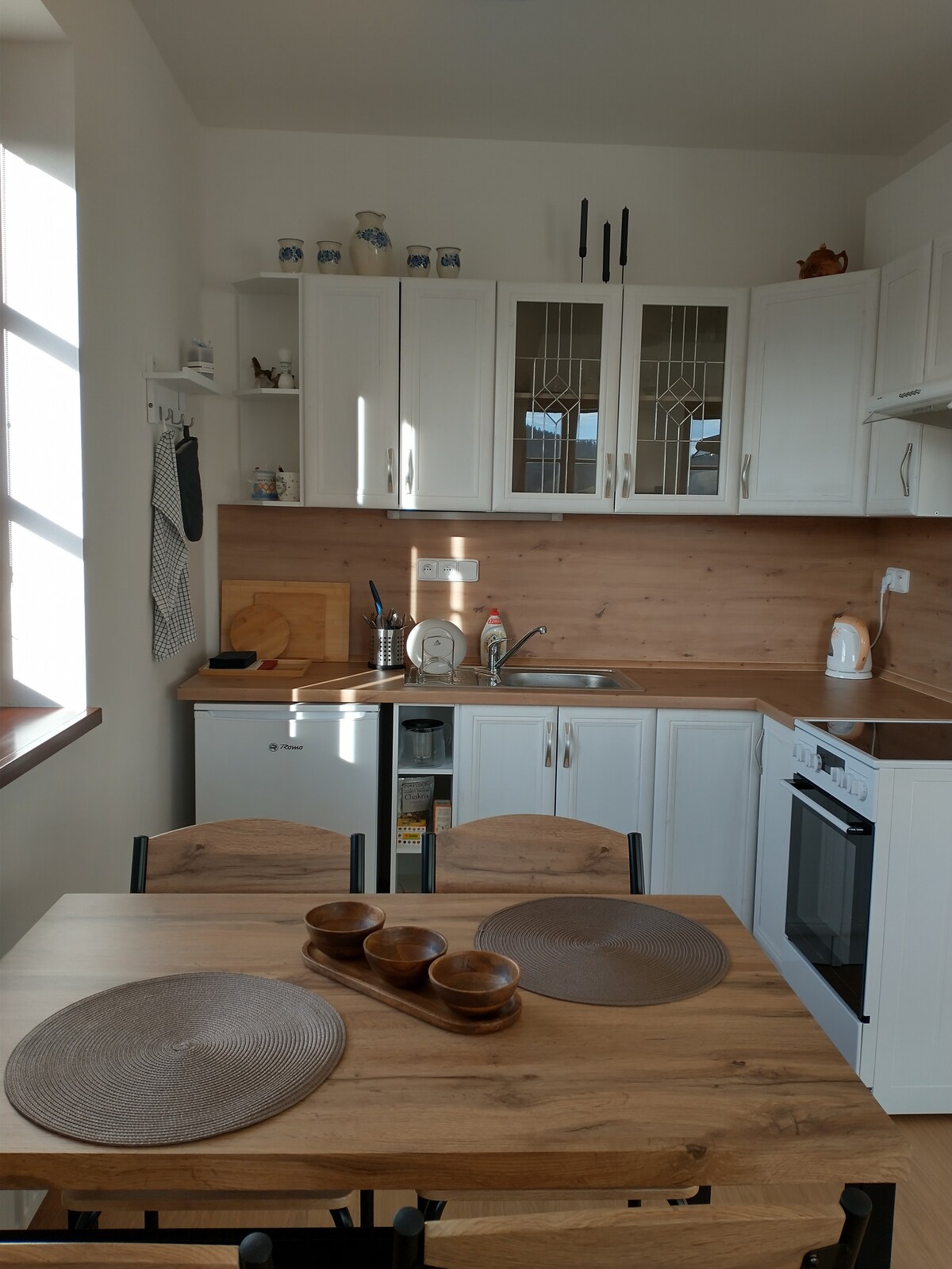 Stylish, sensitively renovated apartment in a historic house. Bedroom with double bed and two beds, equipped kitchen with sofa that can be used for sleeping, and fireplace. Newly built bathroom with shower. The apartment is spacious, suitable for a family of four to five. The house has 15th-century foundations and a unique atmosphere. Parking in the yard. The house is 200 m from the square in Kašperské Hory. Close to several restaurants and grocery stores.