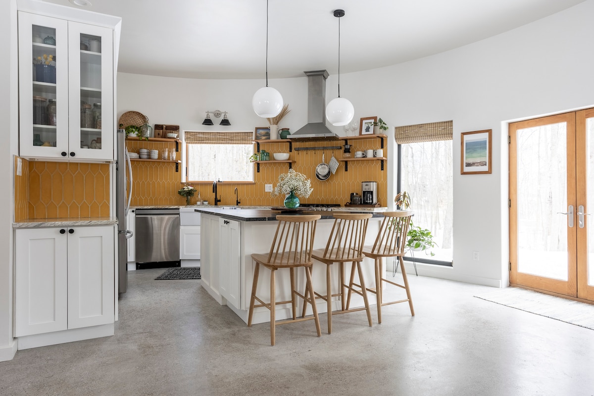 Experience living in the round. This recently renovated home is a super energy efficient 30 ft diameter circle. We are situated in the heart of Sleeping Bear National Lakeshore and a 300 ft walk to a secluded public access on Big Glen Lake. A place to adventure, relax and restore: this home is designed for sustainability and comfort. The perfect home base to explore the wonder of Sleeping Bear and surrounding quaint towns. We hope you find inspiration and rejuvenation.