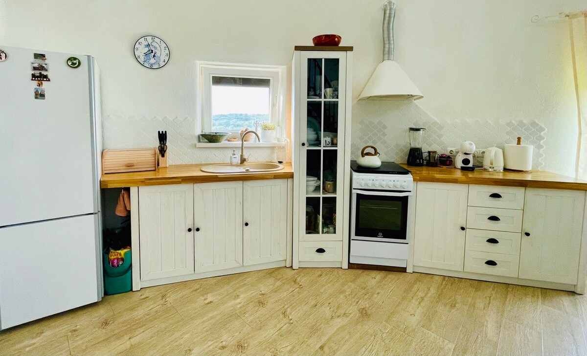 It is a well-equipped apartment studio with a large terrace where you can enjoy morning coffee. The territory is fenced, with a large yard. There is a WC and shower in the House. A double bed and a Soft corner with a sleeping part, wardrobe for clothes. Big TV, is Netflix and Wi Fi. Fireplace. Outdoor Tennis courts and a swimming pool are available for a warm season. The kitchen is equipped with an induction hob, fridge and sink. Here you can find everything you need for a short while.