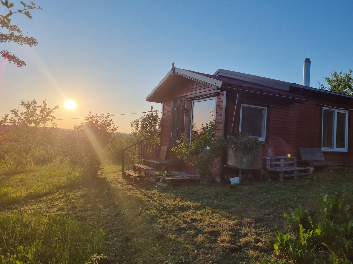 The cottage is located on a mountain, on the outskirts of a small village, surrounded by nature. Nature lovers will love it because the mountain offers great views, especially sunsets. 400 meters away flows the river Nevėžis, where you can swim, fish. The cottage has electricity, a gas stove, a stove, air conditioning, a refrigerator. Compostable toilet outside. There is no water in the house. It is transported in containers from our farm. There is no shower or hot water. There is a large gazebo, swing, fireplace. Access 200m. outdoor road through our yard.