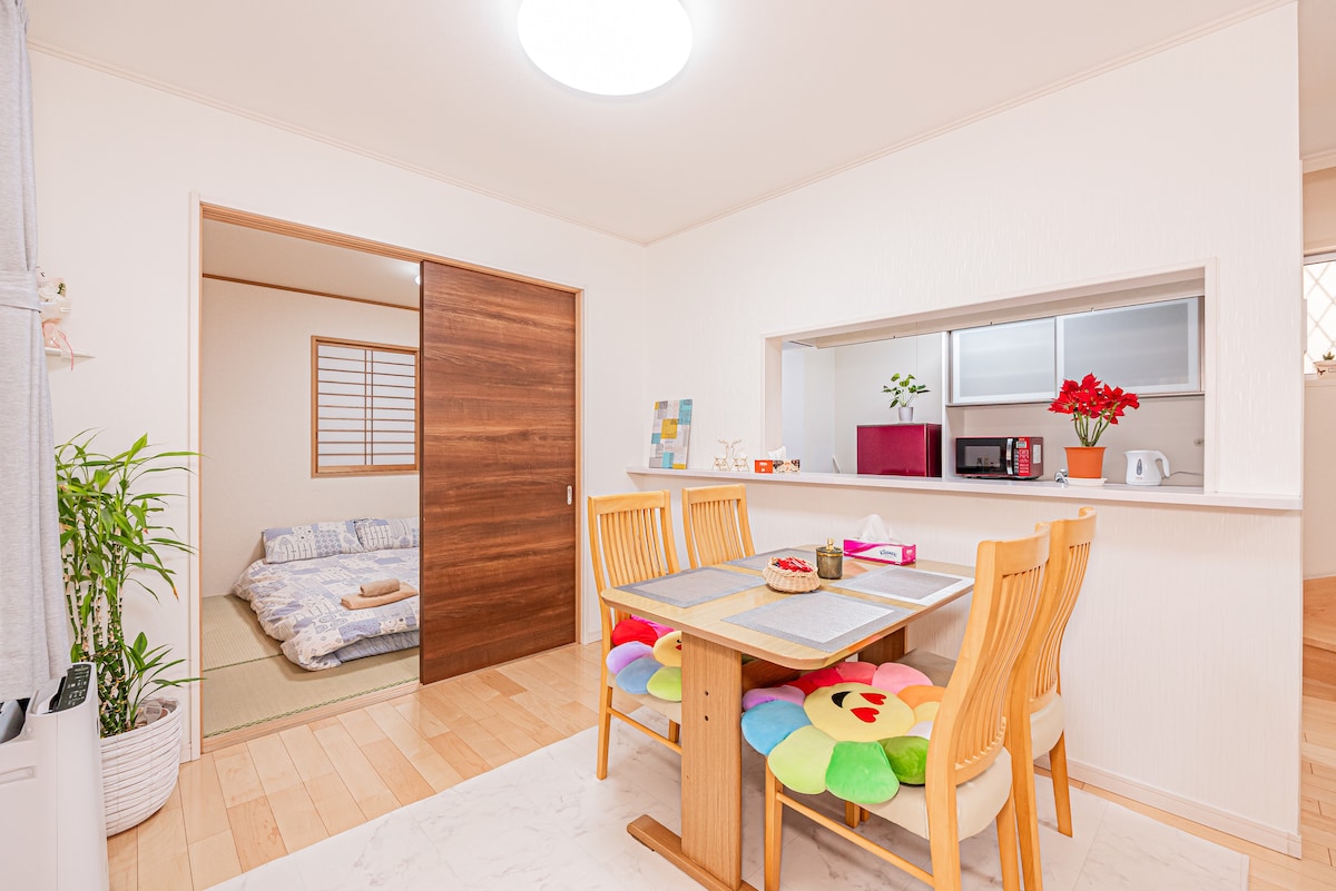 Kawaguchi A House • Type: 4LDK (4 rooms with kitchen, dining room, etc.), the room is spacious and has excellent light, family gatherings/friends are not crowded • Beds: Bedroom one has 2 double beds, 3 and room can expand 6 single tatami (Japanese futon), up to 10 people can live • Station: 8 minutes walk from Kawaguchi Station, it is in a great location, surrounded by shopping, and is a very good place to live. Surrounding Ario shopping mall (large complex mall) for all day shopping, it is a great place to fully enjoy your leisure time. From the residence, the JR Keihin-Tohoku Line provides direct access to Tokyo Station and into Tokyo. Popular areas: Ueno in Tokyo, Akihabara, Ikebukuro, Shinjuku, Shibuya Popular spots: Tokyo Tower, Tokyo Skytree, Kawagoe Scenic Area called [Koedo] The residence is equipped with a full bathroom (with a bathtub), washing and drying machine, microwave, refrigerator, rice cooker, TV, a spacious balcony to dry, has created a perfect environment for long-term living, and there is plenty of indoor space, whether it's friends or family traveling.