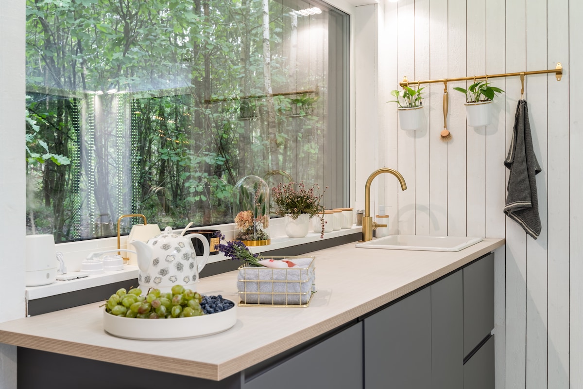 A design-lover’s retreat near Riga. This stylish cabin is next to our plant nursery, with a cozy café just steps away. Surrounded by trees and flowers, it’s the perfect place to disappear for a while. We have robes, slippers, toothbrushes, towels, hair dryer, hair straightener, shampoo, conditioner! Also a free bottle of water, spices, coffee, tea, olive oil, hot chocolate etc! wood-fired hot tub, 60€/per booking (request latest 1 day in advance) For more info: oranzerija.kabriolets