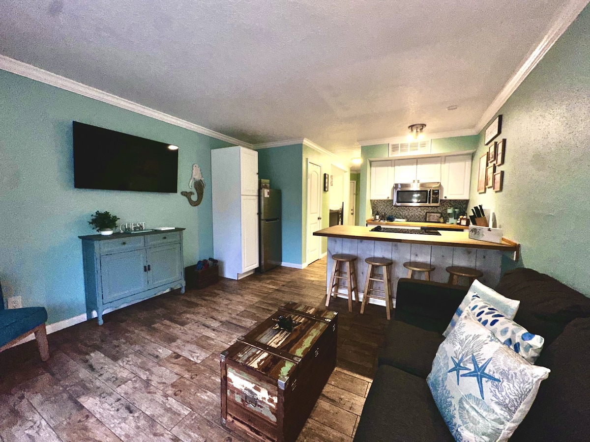 Gorgeous 2 bedroom 2 bath condo right across from Babe’s Beach! Enjoy the views right from the balcony There is a pool hot tub tennis and pickleball court Also Captain's Cove does not charge a parking fee for the first car Condo right across Seawall Blvd to the beach Walmart is 1 mile away