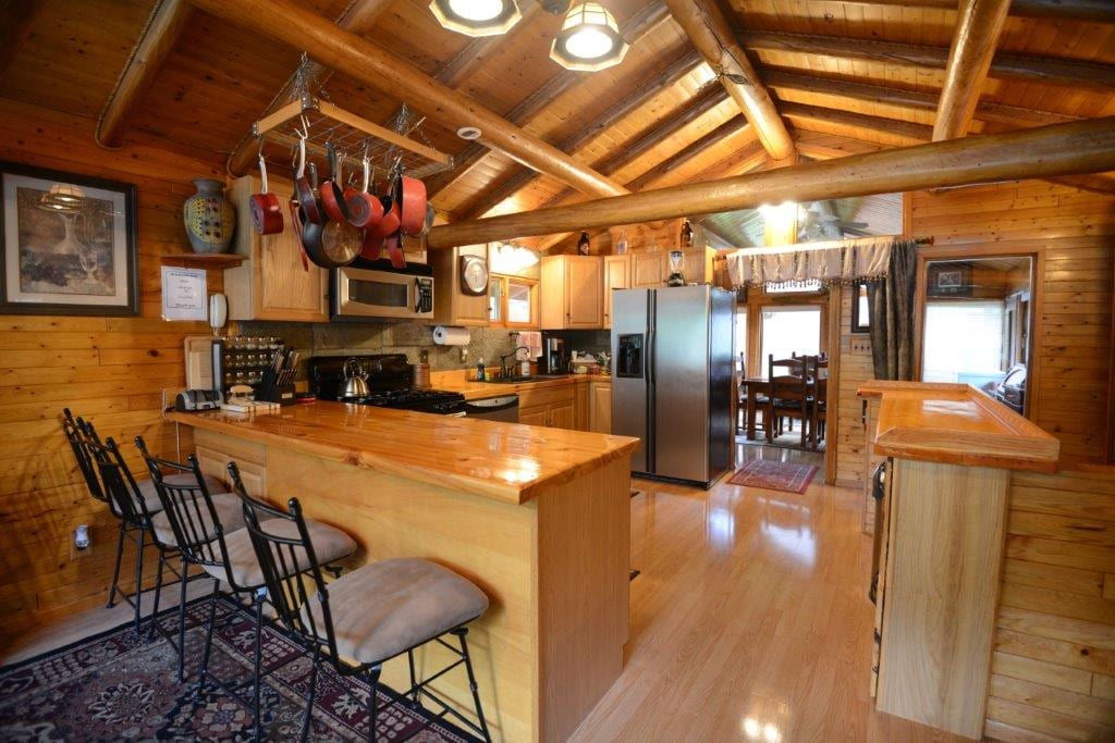This incredible log home features a luxurious master bedroom with a king bed and a private bath in the loft. The downstairs area includes three queen beds and a convenient half bath with a washer and dryer. The main floor boasts a fully equipped kitchen, a bathroom, and a cozy living room. The six bar stools around the kitchen bar and the six-person dining table provide ample space for entertaining up to twelve guests.