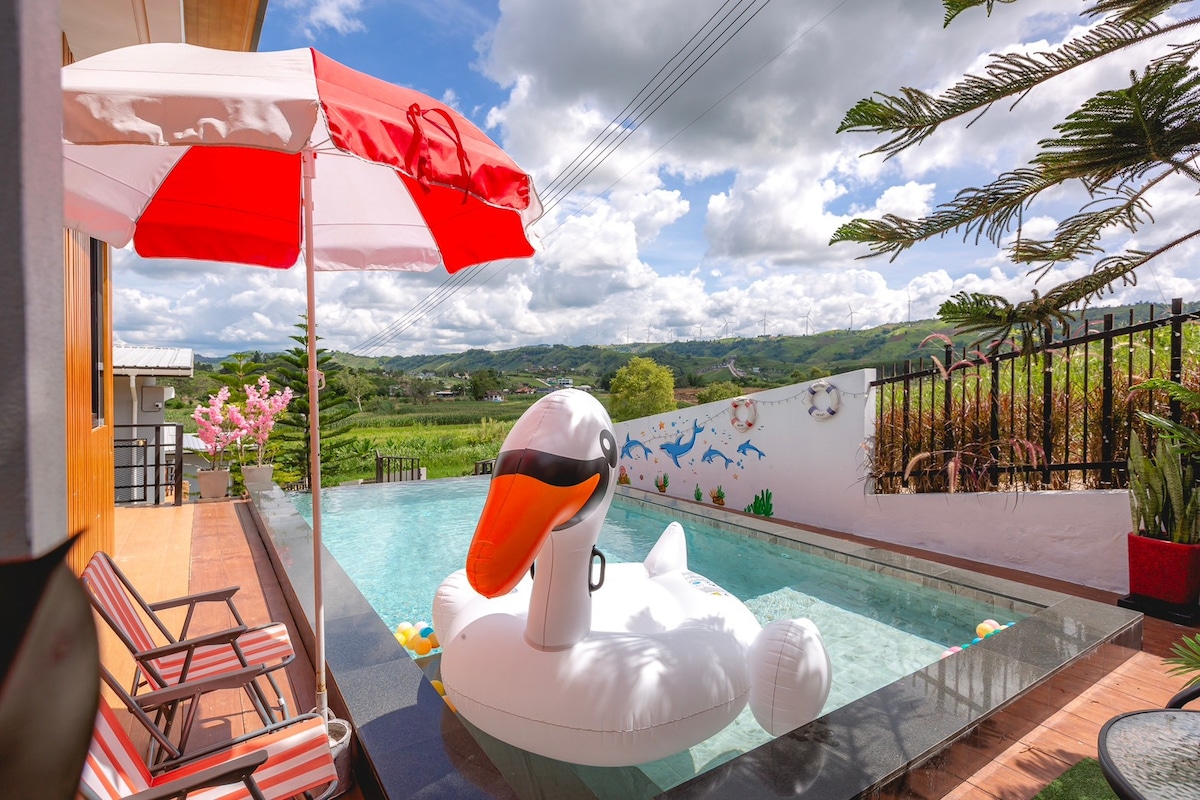 🕋 Large villa with a view of the waterwheel - 700 sqm. house on 3-Rai private land with a vacation home valued at 35 million 📌 Amenities - Bedrooms in various styles - 4 Smart TVs, 65 and 55 inch - TV with free YouTube and Netflix - High speed Wi-Fi 1000/500 Mbps - Kitchen for cooking with a bar for relaxing - 3-in-1 pool table, air hockey and ping pong table *** Can accommodate 8-12 people comfortably. If more people come, we can talk about it. In the evening, eat pork on the terrace with a very close view of the wind turbine. You will not be disappointed. You can also see the mountains, the water and in front of you can see "Wat Phason Kaew". This style of house in Khao Kho is very rare.