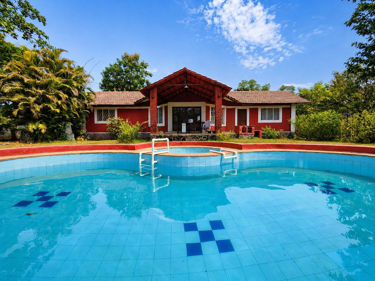 Experience a serene retreat, a picturesque 3-BR 4-Bath farmhouse in Nasrapur, Karjat. This haven, adorned by lush greenery, features a pool, a flowing river & featured in Hotelier India. Crafted with love, the rustic design offers spacious, open areas, inviting a sense of freedom & communion with nature—an ideal escape for a city detox. It stands out for commitment to environmental sustainability. This villa can sleep 15 guests overnight & 30 guests for the day making it ideal for parties.