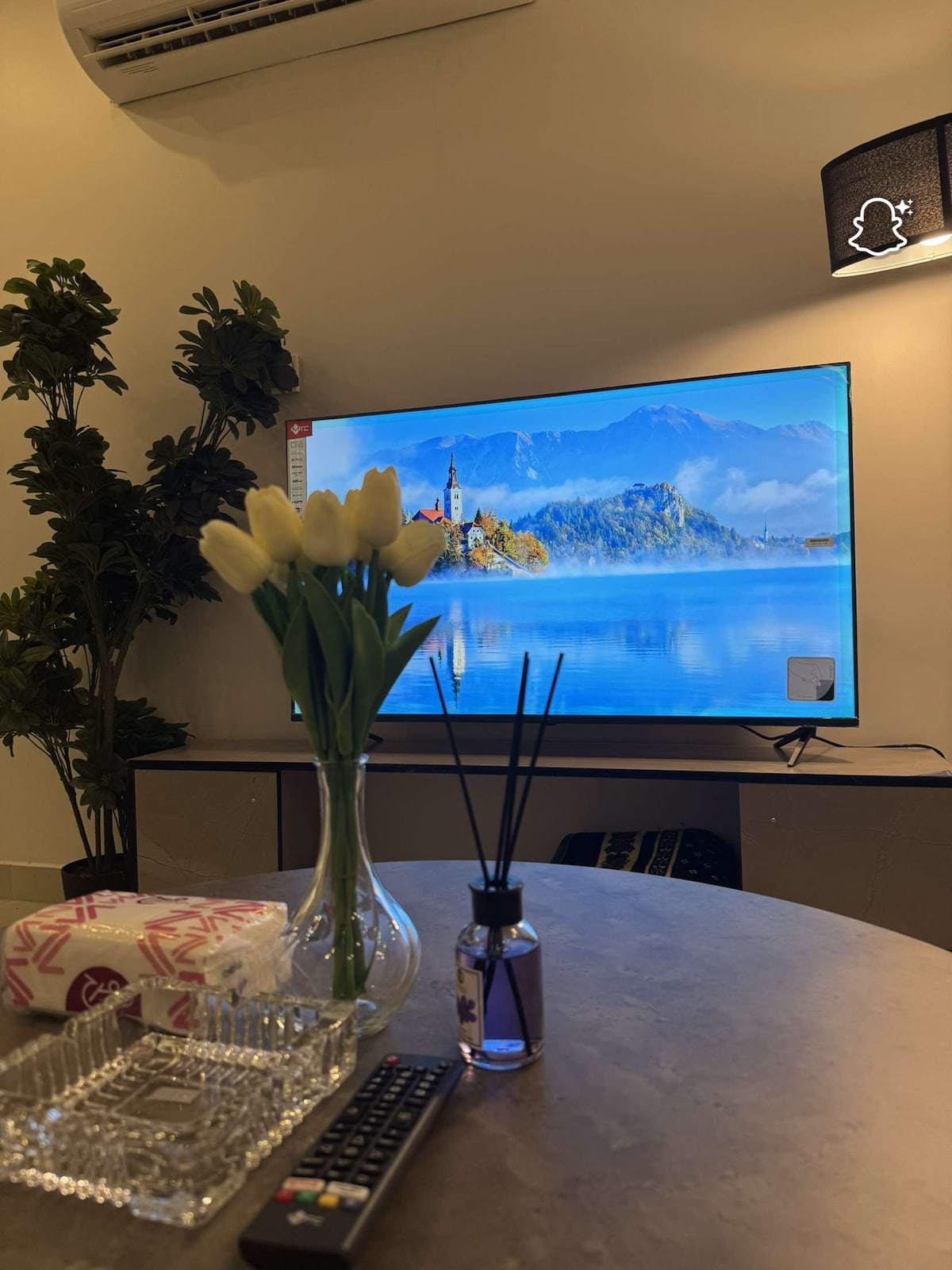 Hayakum Allah in your second home Describing your place and place Modern Studio One Bedroom Double Bedroom Two Comfortable Seating Chairs, 65 "Smart TV, There's a Netflix and a vip in order to complete your beautiful booking as well as 5G WiFi and auromatic spacious indoor washroom And a small kitchen with a microwave, a refrigerator and a water kettle Self-entry The apartment is featured and a commercial street with all services Wahayakum Allah God is in your place.