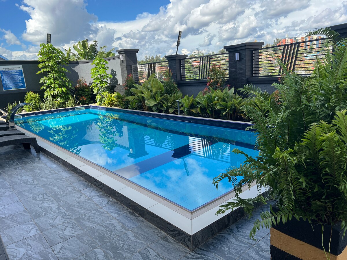 Homey, cozy, and nestled in a beautiful neighborhood, this apartment is close to Lemigo Hotel,Kigali heights shopping mall, 5mins to Radisson Blu and Kigali Convention Center, 8 mins to BK Arena,15mins to the airport and for nightlife lovers, you’re 8 mins away from Kigali’s best party spots in Kimihurura,Like Boho,La Noche , Atelier du Vin and several other popular restaurants and bars. With a full range of amenities, including a pool, this apartment is designed to make you feel right at home