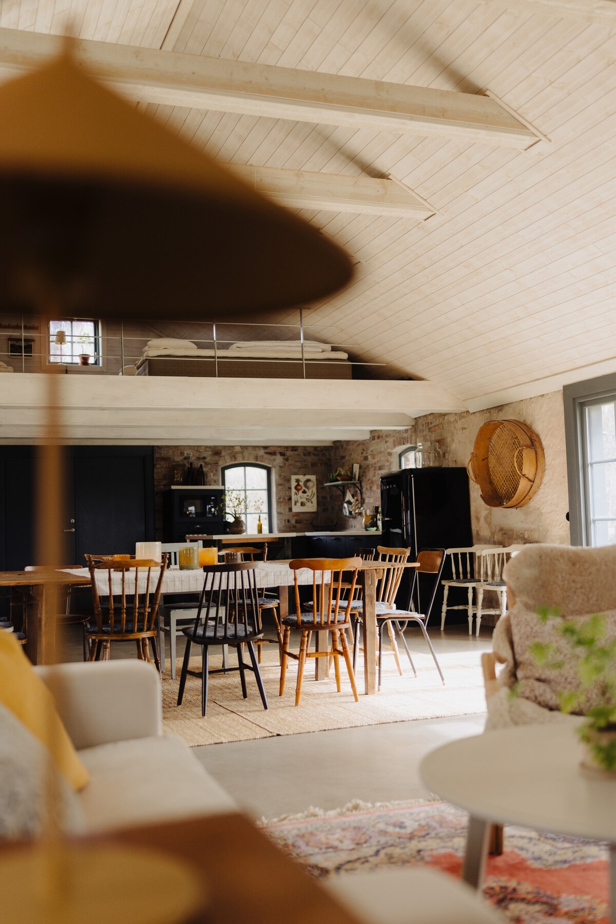 A quarter of an hour outside Borås in Fritsla, this brick building was a pigsty 100 years ago. Here you can enjoy nature and Häggån, which flows 10 meters from the house. It is a quiet area with two other residential buildings a few hundred meters away. The house consists of a single large living room of 100 m2 with kitchen, dining area and sofa area with fireplace. In the sleeping loft, there are 4 beds. Insta: @svinhuset_ If you want to book the house for photography or other events, please contact us for pricing.