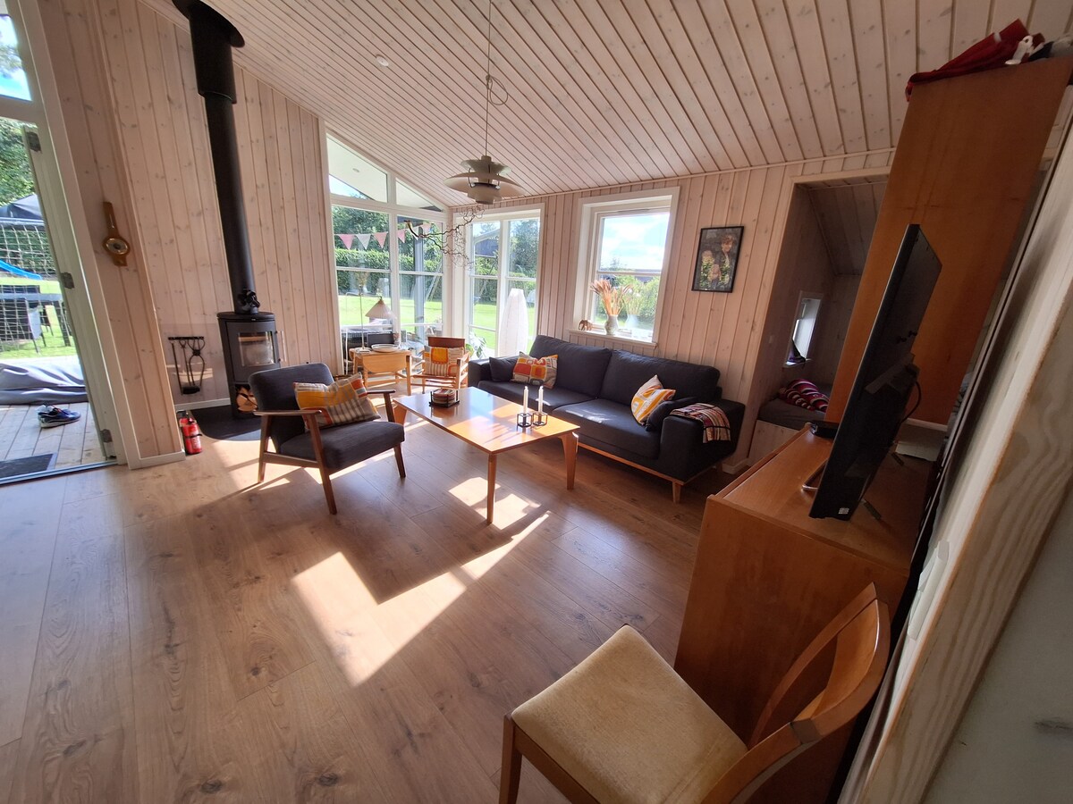 Modern and spacious holiday home with plenty of room for relaxation and togetherness. The house is well laid out with Wi-Fi and TV and is set on a fenced, private plot bordering open fields. Perfect for peace, nature and quality time – both indoors and outdoors, all year round.