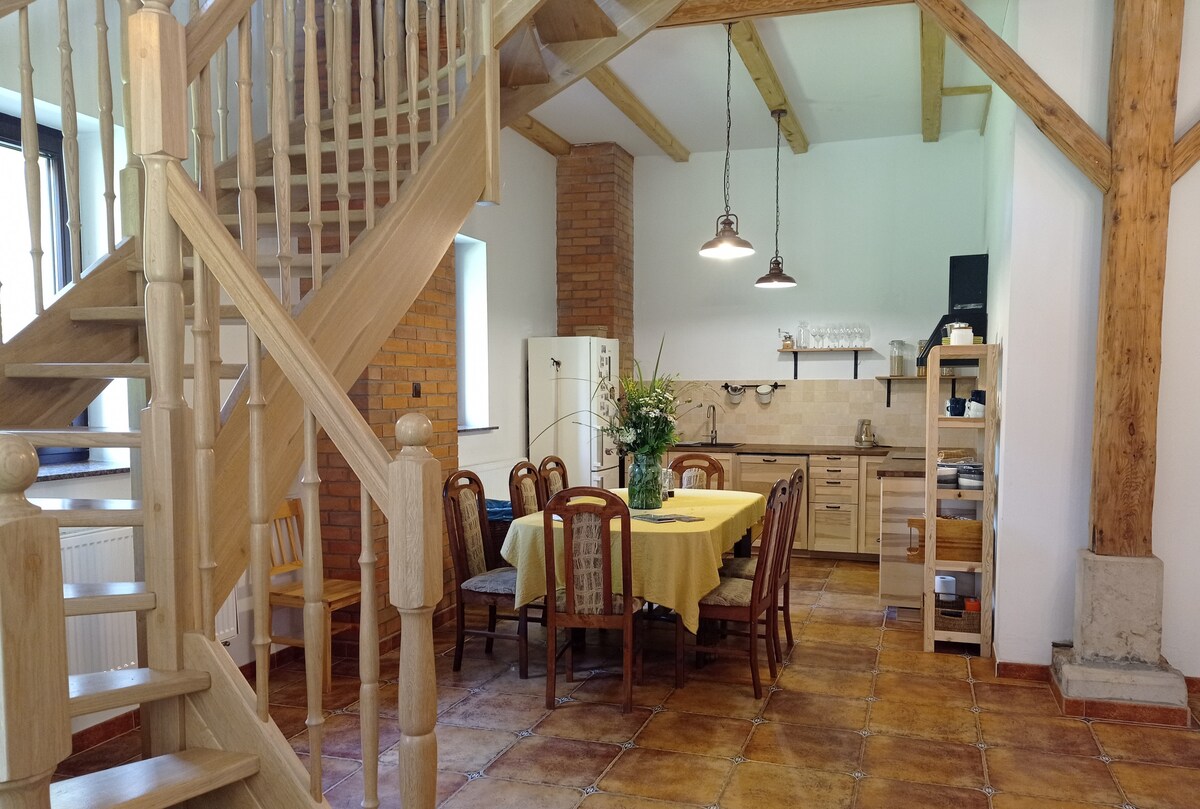 Welcome to the Stołowe Mountains (Sudetes). The barn Ku Lasom is an ideal place for families with children, groups of friends and acquaintances. Fenced parking, safe place for children, open kitchen with dining room, comfortable large table, fireplace area, exit to the garden. In the garden there is a sauna, fire pit, barbecue, hammock, and trampoline. Every place in the barn has a beautiful view of the trees, sky, mountains and forest. It is an oasis of peace. The horizon of south-facing windows is closed by the unique Table Mountains National Park.