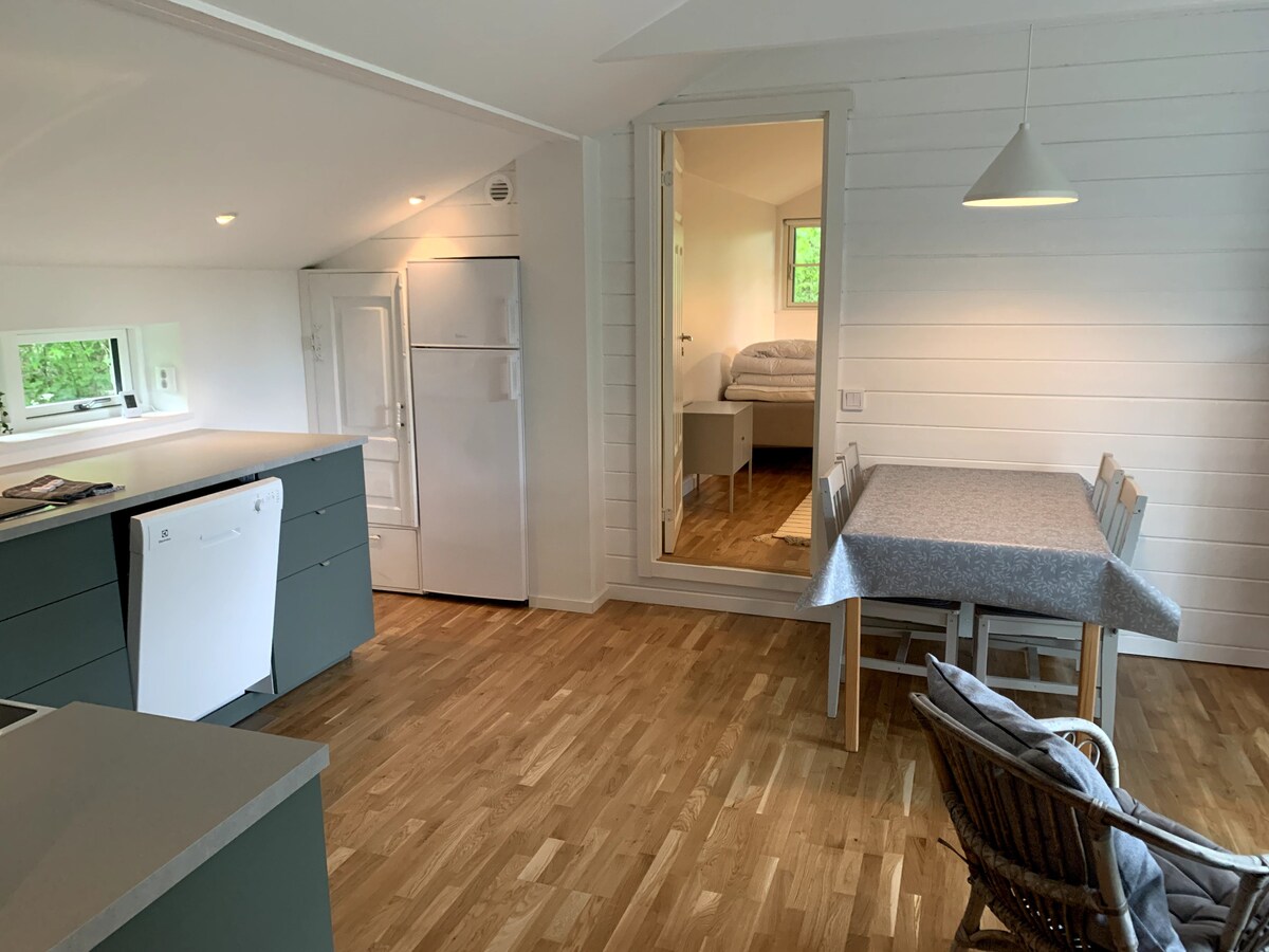 Her vil I bo! Frisk og veludstyret lille feriebolig i naturskønne omgivelser, 5 km syd for Visby. Ideel til et afslappende ophold for 2 voksne og 2 børn. På 1 sal er der to senge (80x200 cm), og i stuen findes en sovesofa (udslået 180x200 cm). Der er skærme med HDMI-kabel på begge etager. Tæt på havet med smukke solnedgange. Gåafstand til Prinsesse Eugénies Fridhem, Kneippbyn og naturreservaterne Högklint og Kuse änge. Røgfrit og husdyr ikke tilladt. Hyggelig gårdhave med grill.