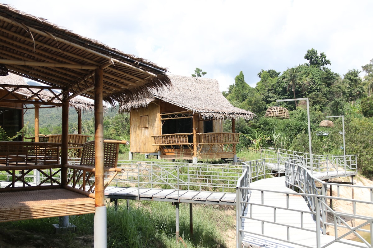 🏝️ Discover a peaceful Oasis in Hin Kong. Sleep in rustic bamboo bungalows, surrounded by coconut palms, birdsong, and the gentle sound of a flowing river. Gather in open yoga shalas, cook together in the shared kitchen, or share stories by the fire under a starry sky. Just a few minutes from Hin Kong Beach, designed for travelers seeking peace, this sanctuary invites you to slow down, reconnect with nature, and embrace the simple beauty of island life.