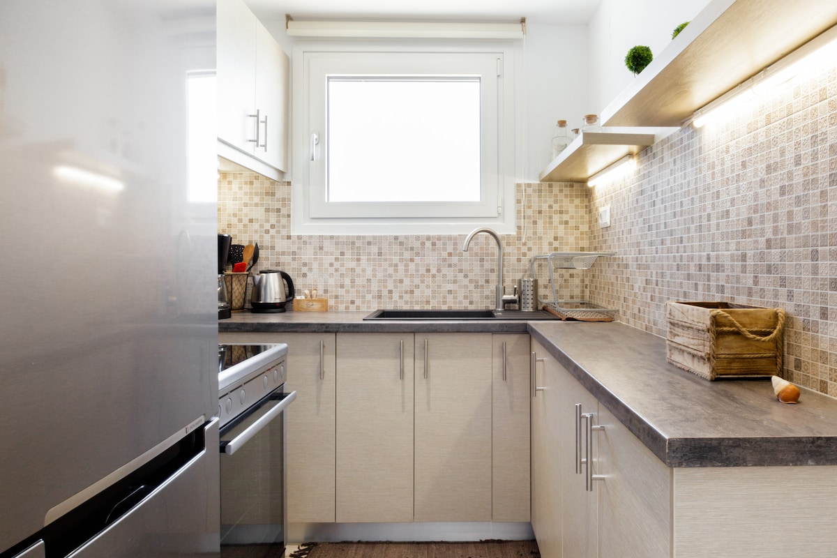 Renovated Loft with a breath-taking view, just 2 minutes away from the beach. With 2 bedrooms, 1 bath, open plan area and a beautiful outdoor sitting area, this loft is the perfect place to house your vacation. Suitable for a Family or Friends. With a walk around the neighbourhood you'll find beautiful beaches with sun-beds, Supermarket that stays open untill late at night, pharmacy, bakeries, bars, cafes, many restaurants by the sea, and traditional tavernas for more of a local cuisine.