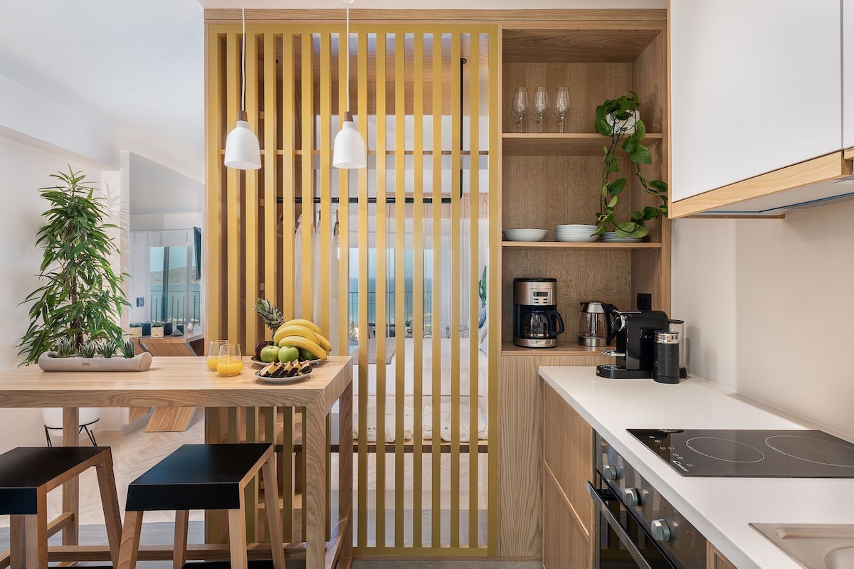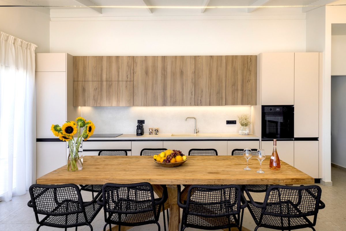Pachnes has 4 luxury apartments: Pi (6 guests), Alpha (4 guests), Chi (4 guests), and Ni (2 guests). This is Alpha with a king-size bed in 1 bedroom, a double bed in the attic, large windows, blackout blinds, verandas, and terrace with city skyline and natural landscapes. The modern design comes with top-of-the-line appliances. Enjoy a fully-equipped kitchen with a refrigerator, oven, microwave, and coffee area. The property offers a large shared pool and a baby pool for the four apartments.