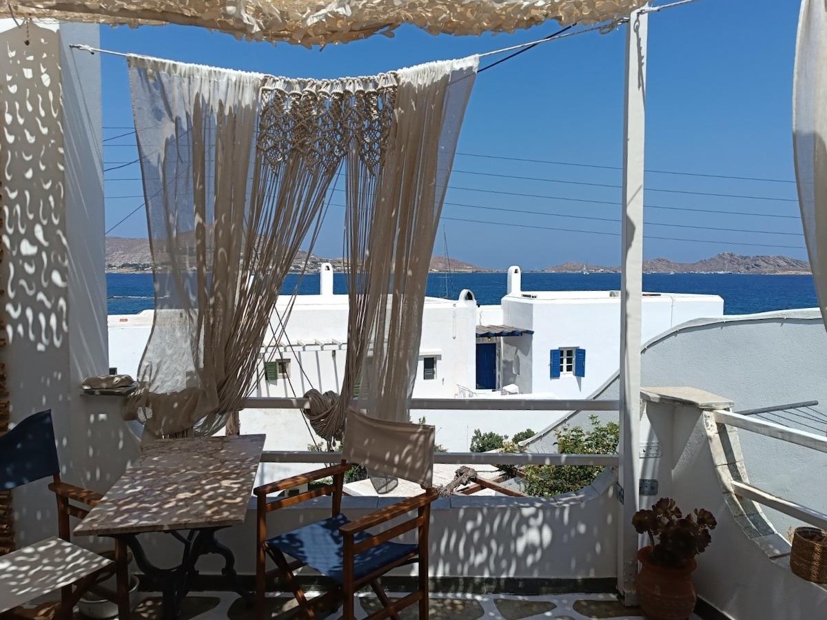 Open the sea-blue shutters and let in the cooling breeze, then whip up a snack at the urban concrete kitchen countertop at a breezy waterfront retreat. Step onto the spacious, leafy veranda for leisurely sunset drinks with unobstructed ocean views! The apartment is situated next to a sandy beach for a morning swim and a 2-minute walk from the center of Naousa and its main square. Shops, restaurants, bars, and clubs are within walking distance, yet the area is very quiet and calm!