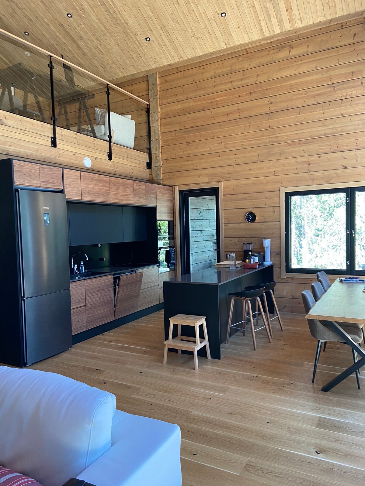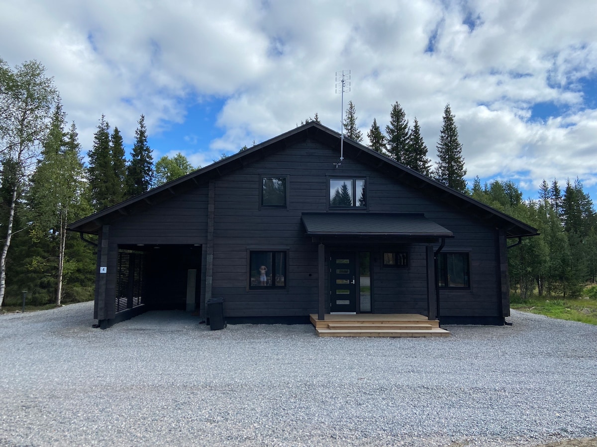 New luxurious villa in Levi. Near services but still in peaceful location, next to forest and ski trail. 80m² in two floors; 2 bedrooms, sauna, 2 bathrooms, kitchen and livingroom which big windows show a beautiful Lapland scenery. Hot tub at the terrace. Covered parking space next to chalet and more free parking in the beginning of the chalet area. Shared hut in the middle of the area. Security camera at the front door. Free Wi-Fi. ig: levinkuiskaus