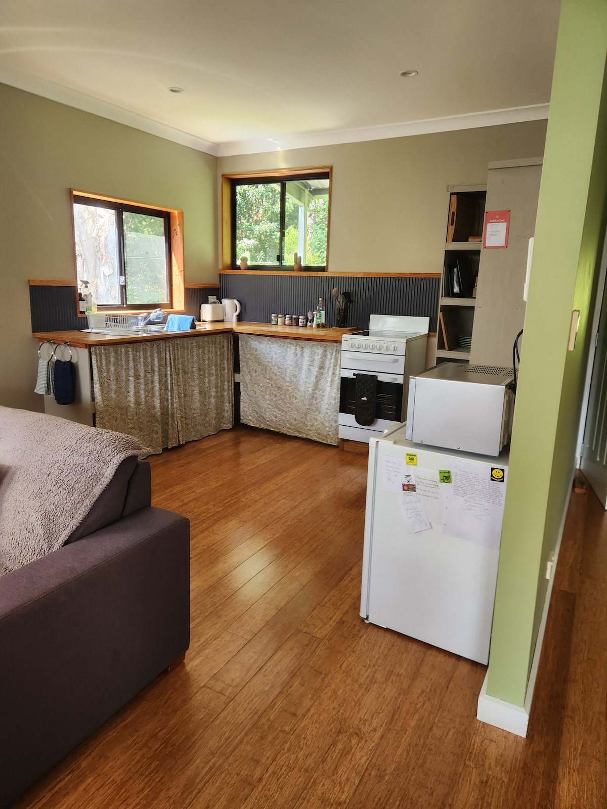 The Barn is a private space tucked away on 100 acres of rolling hills, rainforest, and macadamia orchards well away from the main house, with stunning views of the foothills of the Nightcap Range. A perfect spot to unwind, with peaceful walks to a secluded swimming hole and waterfall. You’ll share the land with wallabies, echidnas, donkeys, goats, a cow, 3 calves and our friendly green frog, Frankie. A short drive to Clunes, Federal, and Bangalow, it’s a quiet escape to rest and recharge.
