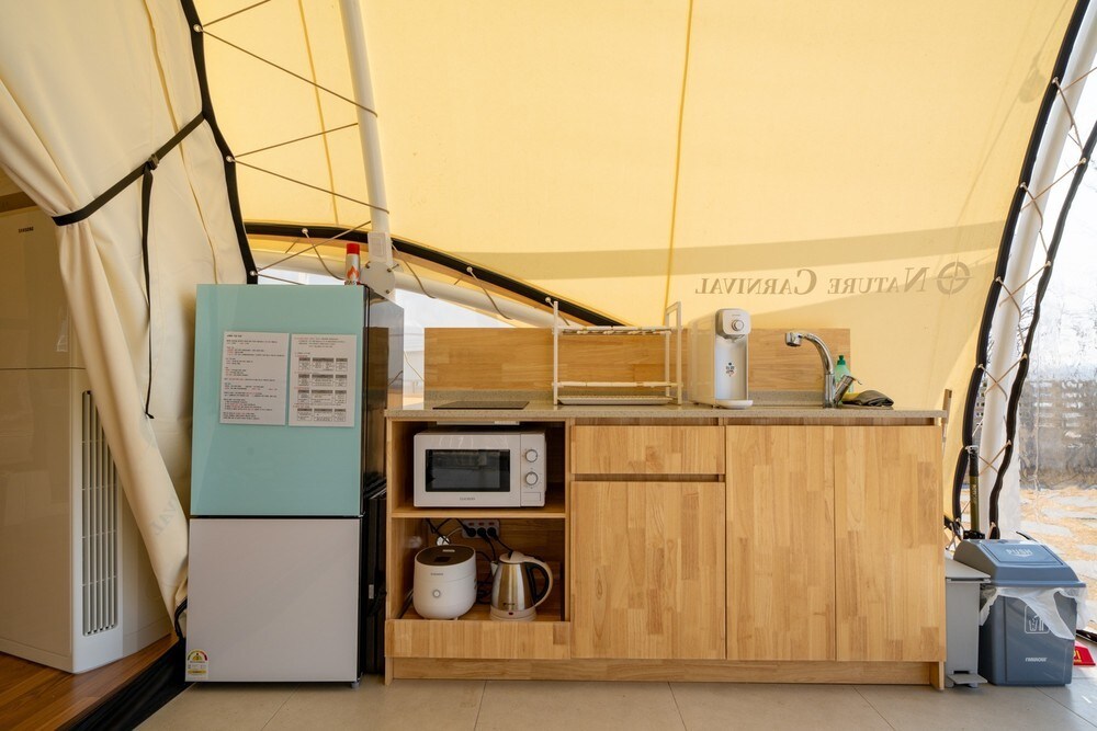 Hi. We are ONDA, a company that researches and provides a variety of relaxation spaces. We hope that everyone who stays here will have a comfortable and happy time. [Accommodation Introduction] Newly opened in March 2024! 2.7 km from Dongyeoju IC, 50 minutes from the metropolitan area on weekdays. You can fully enjoy barbecues and bonfires in the spacious individual gardens. Individual hot water pools are available 365 days a year at the glamping site. We have prepared as wide as possible per site so that you can rest without being disturbed. You can enjoy a cool view from all sites. It's a comforting break, The Hill Glamping. [Room type] Studio type (1 double bed + kitchen + 1 toilet) * Bedding is provided according to the number of people booked.