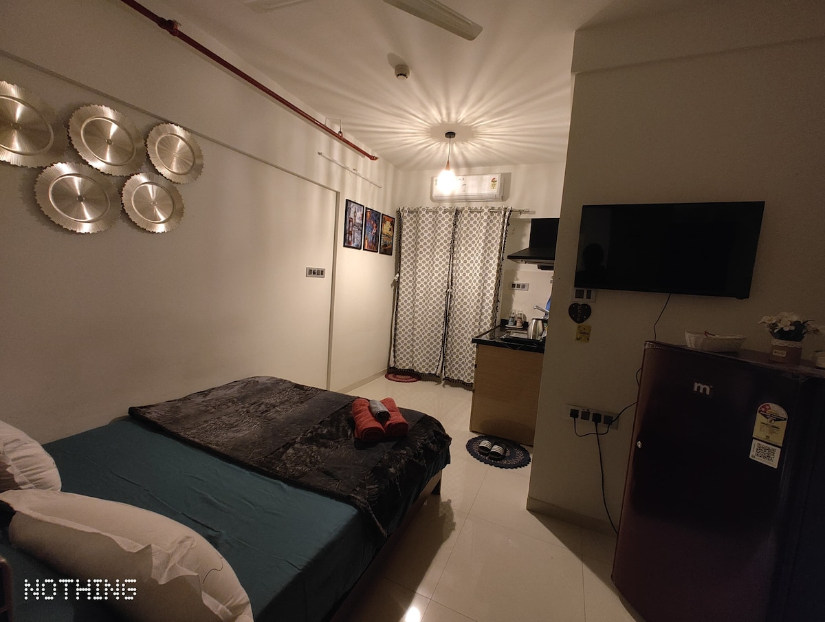 MIDDLE : Calm in the MIDDLE of chaos. A peaceful studio just 5 mins from Pune Airport ✈️ 🛏️ Comfy double bed with fresh linens 📶 High-speed Wi-Fi & 📺 43” Smart TV w/ OTT | Netflix | Prime | Youtube Premium | Etc. 🌇 Private balcony & warm lighting 🍴Cooking essential, induction, kettle, fridge 👫🏻 Couple Friendly 🛁 Clean bathroom with essentials 🔐 Gated society with 24x7 security & CCTV 🛎️ Self-check-in, calm & family-friendly 📩 For more details, feel free to contact us!