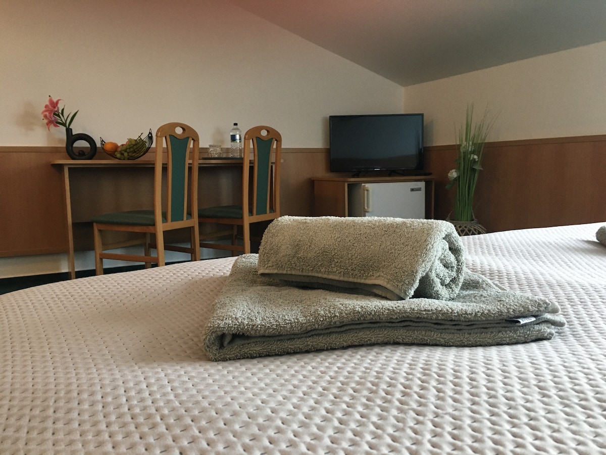 Útulná podkrovná izba s manželskou posteľou alebo dvoma oddelenými posteľami s možnosťou prístelky v blízkosti centra mesta. Vybavenie izby: veľkosť izby 20 m2 dvojlôžková posteľ možnosť prístelky za príplatok vlastná kúpeľňa so sprchou a WC uteráky a osušky WIFI bezplatne na izbe LCD TV so satelitným vysielaním